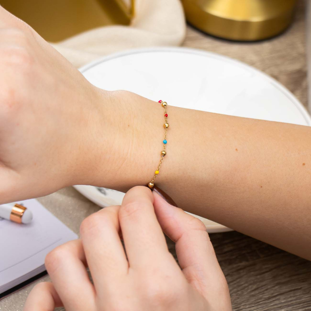 Pozlacený náramek z chirurgické oceli s barevnými detaily. Zářivý, jemný a nadčasový doplněk pro každodenní eleganci.