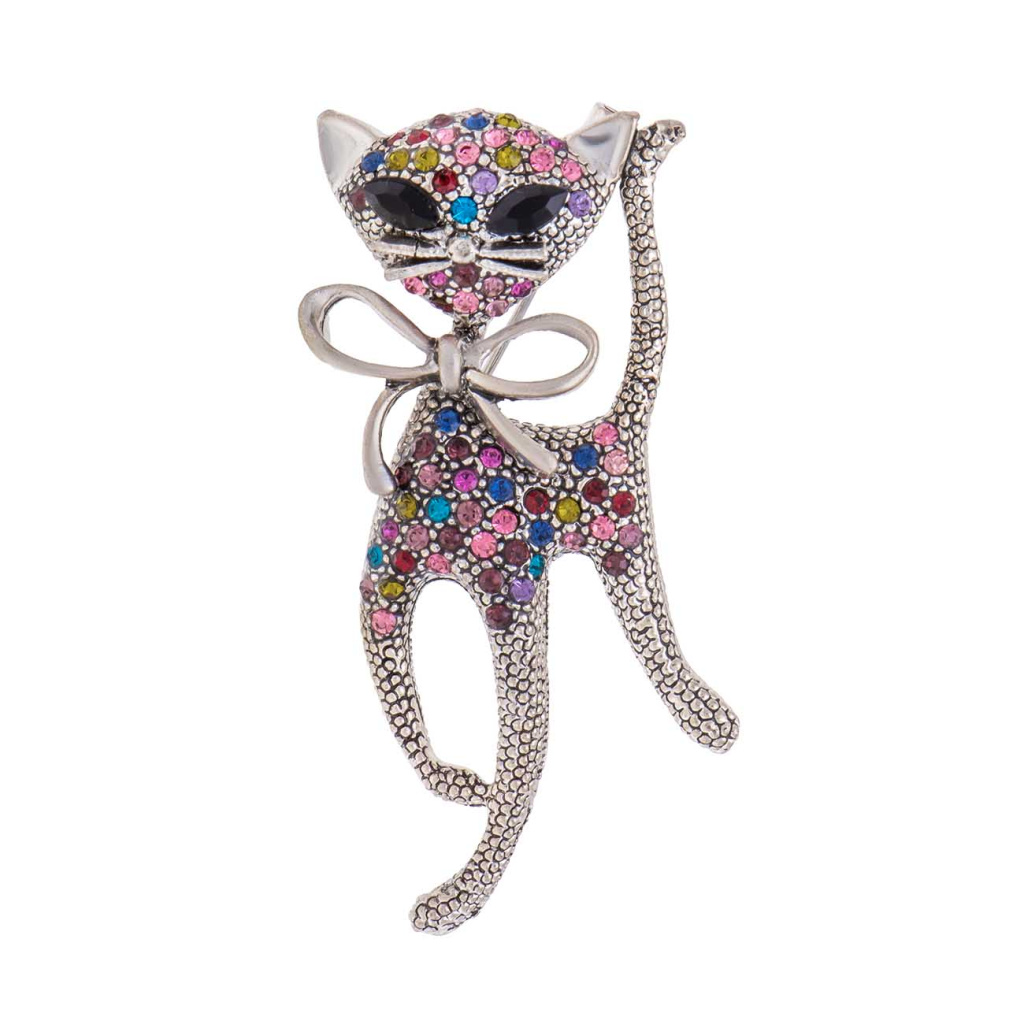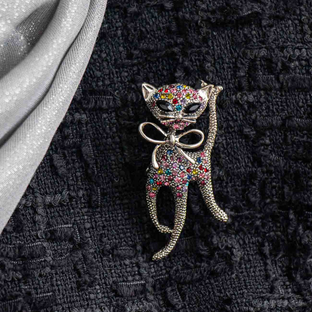 Originální brož ve tvaru elegantní kočky zaujme detailním zpracováním a bohatým osazením barevných zirkonů, které jí dodávají výrazný a šperkový vzhled. Stylová mašlička na krku podtrhuje hravý charakter motivu a činí z brože nepřehlédnutelný doplněk. Skvěle se hodí na kabát, sako, šaty i šálu a potěší všechny milovníky koček i nápaditých módních detailů.
