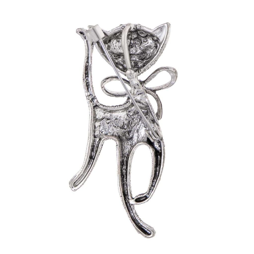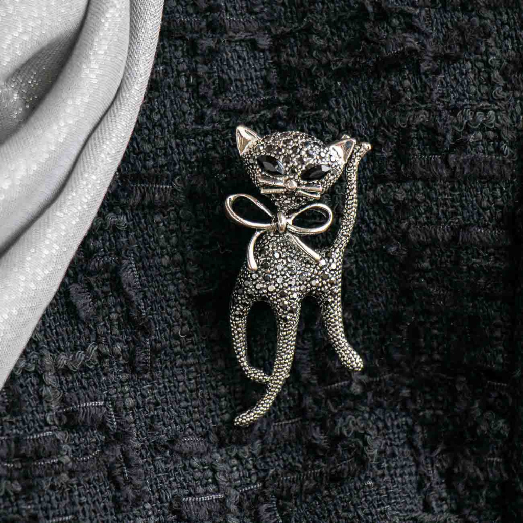 Stylová brož ve tvaru kočky je zdobená drobnými zirkony v elegantním stříbrném tónu, které vytvářejí decentní, ale přesto výrazný efekt. Čisté linie, mašlička na krku a precizní zpracování dodávají broži šperkový charakter. Skvěle doplní kabát, sako i šaty a potěší každého, kdo má rád zvířecí motivy v elegantním pojetí.