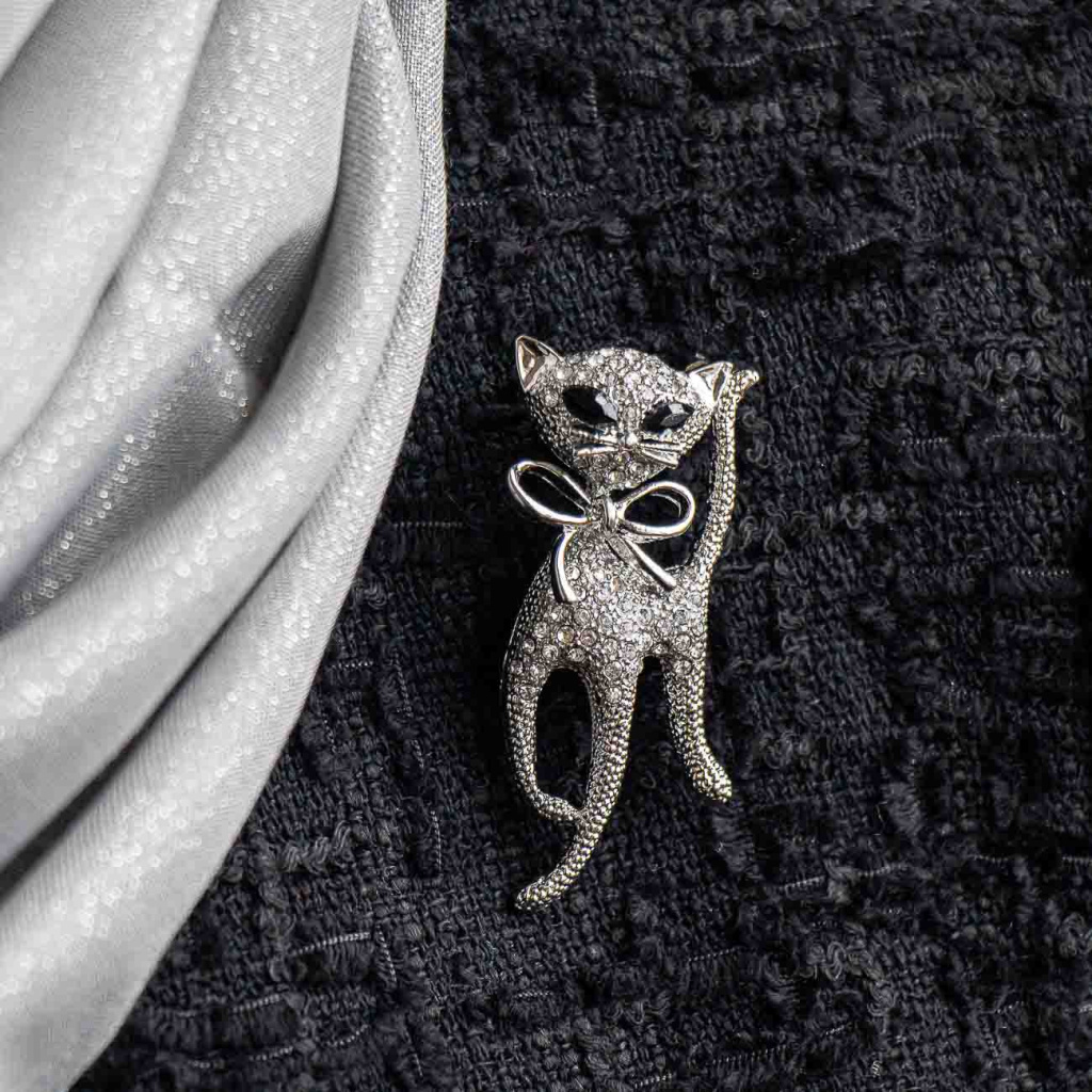 Jemná a elegantní brož ve tvaru kočky je bohatě osazena čirými zirkony, které dodávají šperku výrazný lesk a nadčasový vzhled. Precizní zpracování detailů, mašlička na krku a ladné linie vytvářejí sofistikovaný doplněk, který se snadno kombinuje s jakýmkoli outfitem. Brož je ideální volbou na kabát, sako i šaty a potěší všechny milovníky kočičích motivů v elegantním provedení.