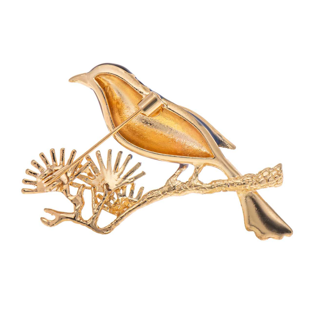 Decentní brož s motivem ptáčka sedícího na stylizované větvi zaujme propracovanými liniemi a jemným barevným smaltováním. Kontrastní kombinace tónů spolu s detaily v bižuterním kovu vytváří harmonický a elegantní celek, který působí lehce, přirozeně a nadčasově. Ideální doplněk na kabát, sako či šálu, který dodá outfitu osobitý akcent inspirovaný přírodou.