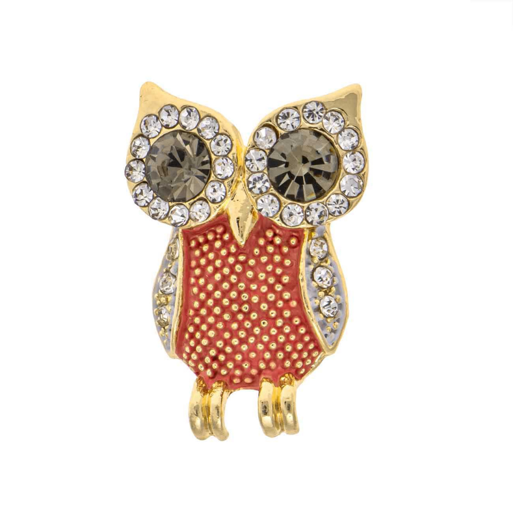 Roztomilá brož ve tvaru sovy symbolizuje moudrost a eleganci. Její výrazné oči jsou osazeny kouřovými zirkony orámovanými čirými kamínky, které jí dodávají třpytivý pohled. Tělo sovy zdobí barevný email s jemnou strukturou, který vytváří hravý kontrast s blyštivými kameny. Tento šperk působí originálně a stane se okouzlujícím doplňkem nejen na saku či halence, ale i na šátku nebo kabelce.