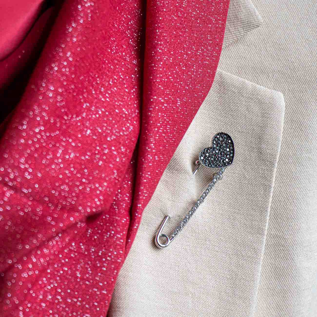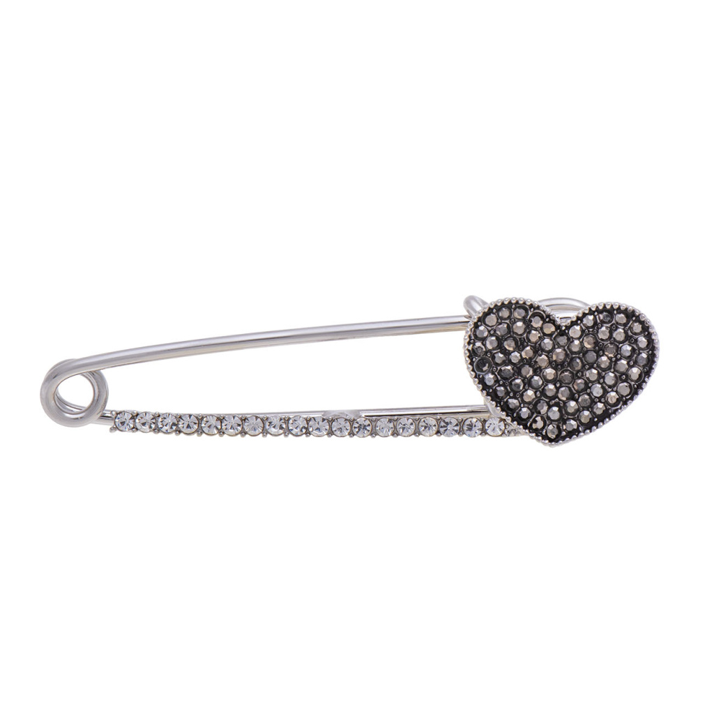 Stylová brož inspirovaná tvarem zavíracího špendlíku zaujme moderním pojetím a výrazným detailem v podobě černého srdce osazeného třpytivými zirkony. Jemná linie doplněná řadou čirých zirkonů působí elegantně a vyváženě, zatímco srdce dodává šperku emotivní a osobitý charakter. Ideální doplněk na kabát, sako i šálu, který decentně oživí každý outfit a přitáhne pozornost.