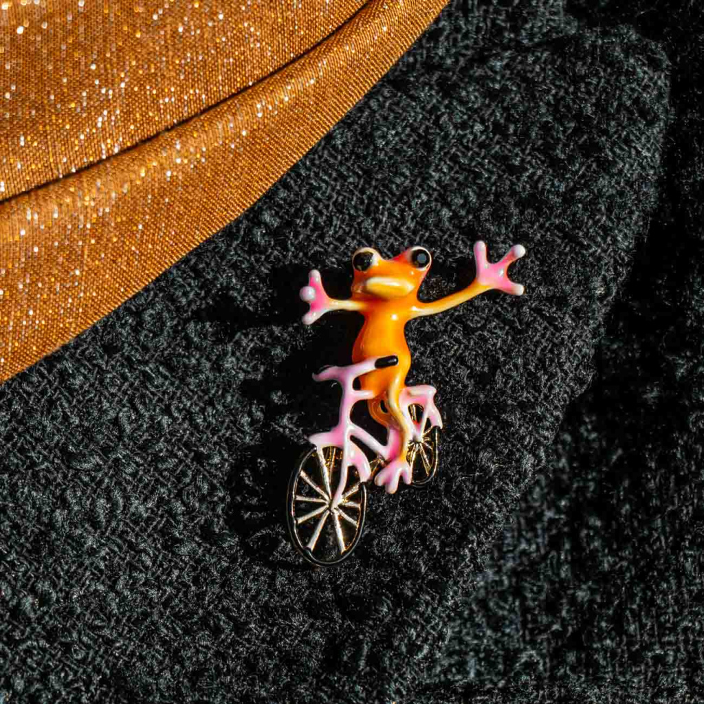 Originální brož s motivem žáby jedoucí na kole zaujme na první pohled svým hravým designem a výraznými barvami. Lesklé smaltované provedení dodává šperku živost, zatímco jemné kovové detaily kola podtrhují precizní zpracování. Brož působí lehce, vtipně a zároveň stylově – ideální doplněk pro ty, kteří se nebojí vystoupit z davu a dodat outfitu osobitý charakter.