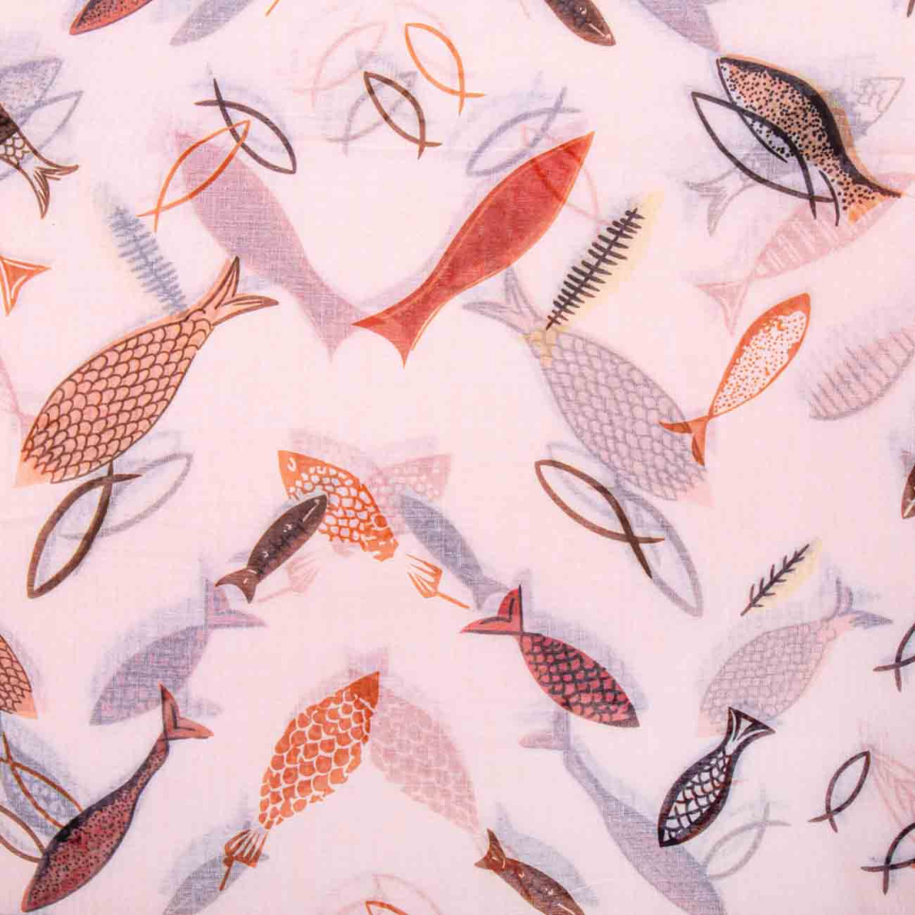 Lehká a hravá šála s jemným motivem stylizovaných rybek působí svěže a originálně. Barevné detaily vytvářejí zajímavý kontrast na světlém podkladu a dodávají šále moderní a zároveň elegantní vzhled. Díky příjemnému materiálu s příměsí hedvábí je šála jemná na dotek, lehká a krásně splývá při nošení.