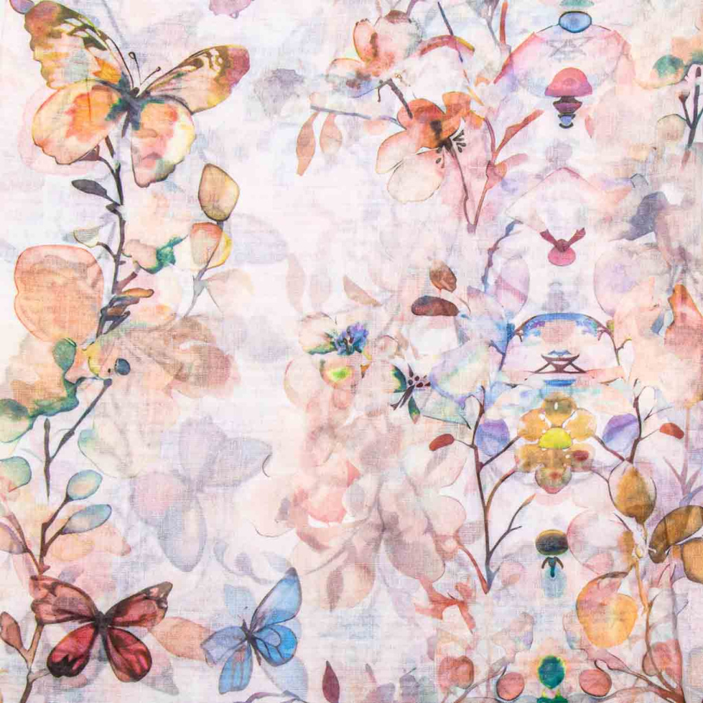 Jemný dámský šál s romantickým motivem květin a motýlů působí velmi něžně a elegantně. Akvarelový styl vzoru v pastelových odstínech dodává šálu lehkost a svěží vzhled. Díky příměsi hedvábí je materiál příjemně jemný, splývavý a krásně doplní jarní i letní outfit.