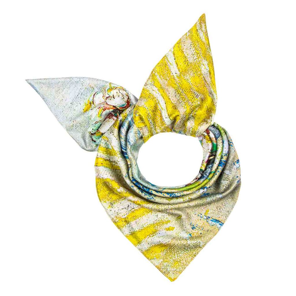 Nechte se okouzlit jemnou souhrou modrých a slunečných tónů, které působí svěže a nadčasově. Tento šátek v sobě spojuje precizní zpracování a výrazný umělecký motiv, díky němuž se stane zářivým doplňkem každého outfitu. Hedvábný lesk dodává celku elegantní a luxusní charakter.