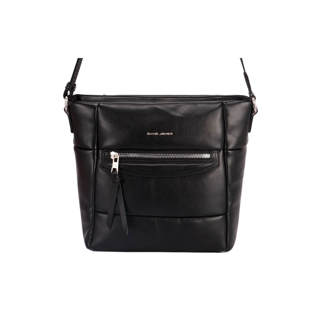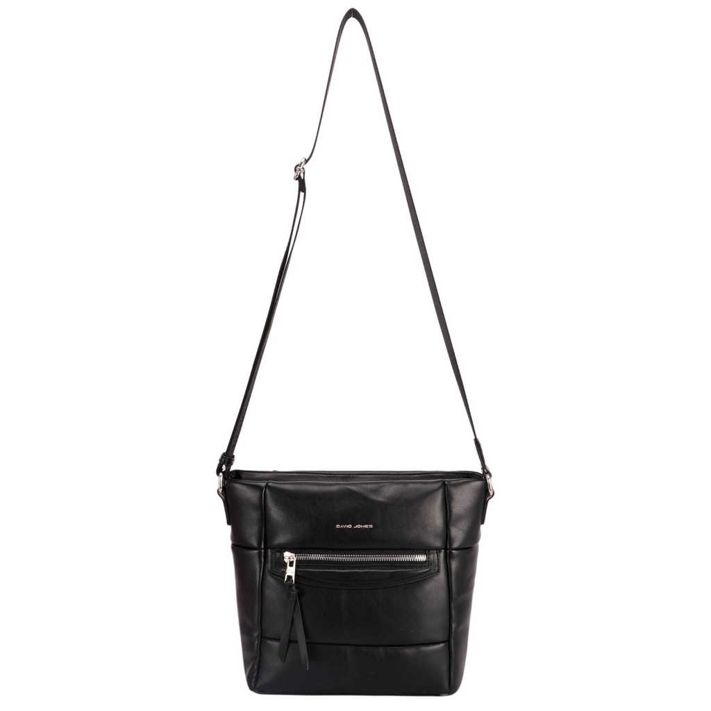 - Přední panel tašky zdobí kapsička na zip a logo David Jones ve stříbrné barvě.