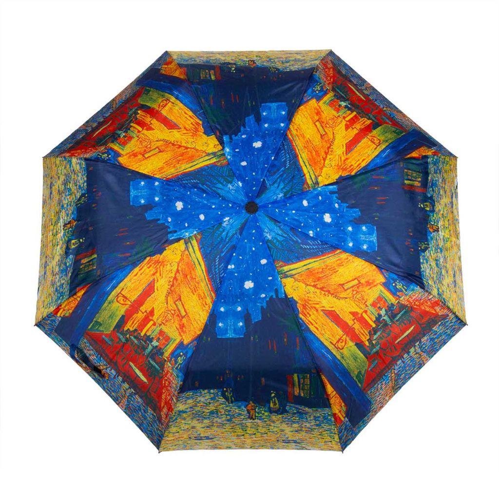 Zahalte se do zářivé atmosféry nočního města s deštníkem inspirovaným dílem Vincenta van Gogha. Výrazné kontrasty modré a žluté vytvářejí dynamický, nadčasový motiv plný energie a emocí. Tento precizní doplněk rozzáří každý deštivý den a dodá Vašemu stylu umělecký nádech.