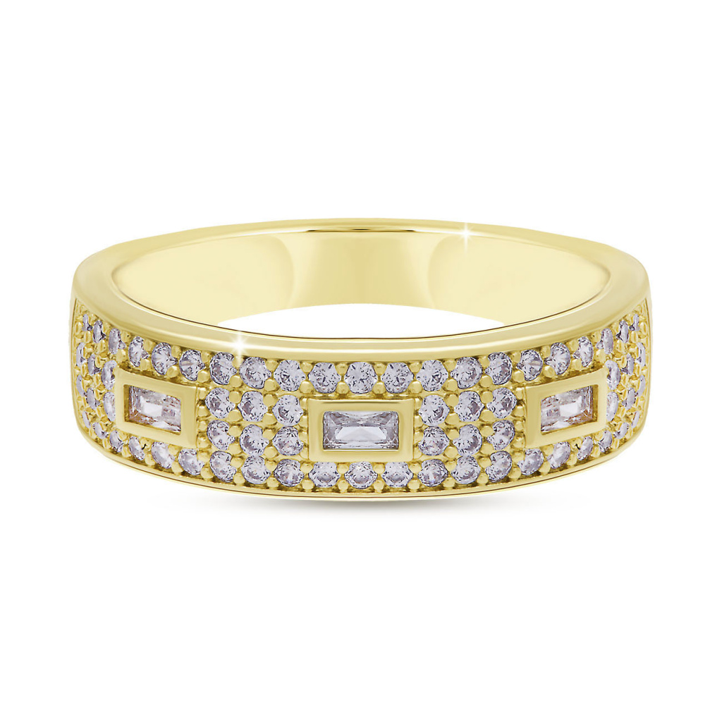 Luxusní a efektní prsten s lesklou pozlacenou základnou a bohatě osazenými zirkony vás okouzlí na první pohled. Dominantním prvkem jsou podélné obdélníkové zirkony, které jsou rafinovaně vsazené do geometrického motivu a orámované drobnými kulatými zirkony. Šperk působí elegantně a přitom výrazně – ideální pro slavnostní příležitosti i každodenní lesk.
