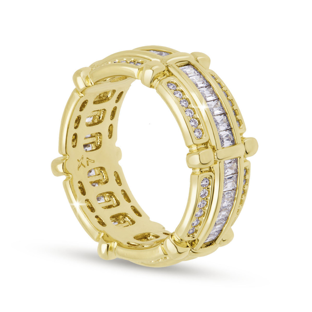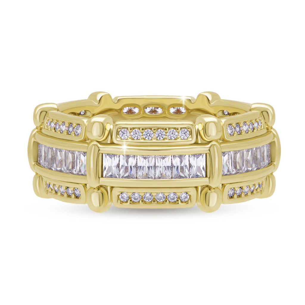 Robustní a zároveň elegantní prsten s kombinací velkých obdélníkových zirkonů a drobných kulatých kamenů. Jeho výrazný strukturovaný tvar s plastickými prvky z něj činí dominantní prvek každého outfitu.