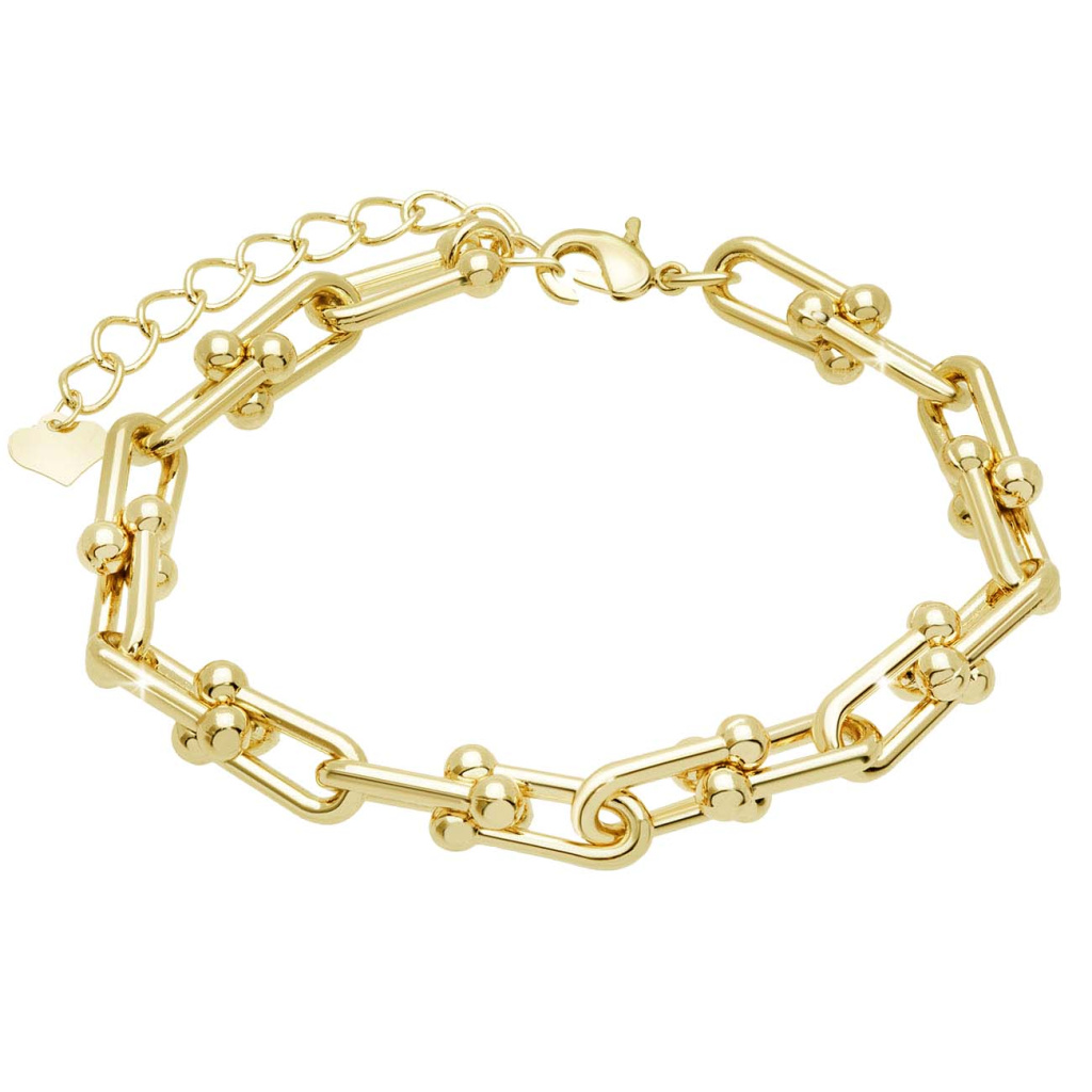 Vylepšete svůj styl tímto úžasným pozlaceným náramkem! Náramek je vyrobený z rhodiovaného kovu a vyleštěný k absolutní dokonalosti. Tento úžasný náramek se hodí k jakémukoliv outfitu pro jeho extra luxusní lesk a zlatou barvu. Skládá se z hranatých oček zakončených kuličkou. Je ideální pro ty, kteří chtějí svému vzhledu dodat něco mimořádného a jedinečného. Náramek je vybaven zapínáním na karabinku. Řetízek typu Anker.