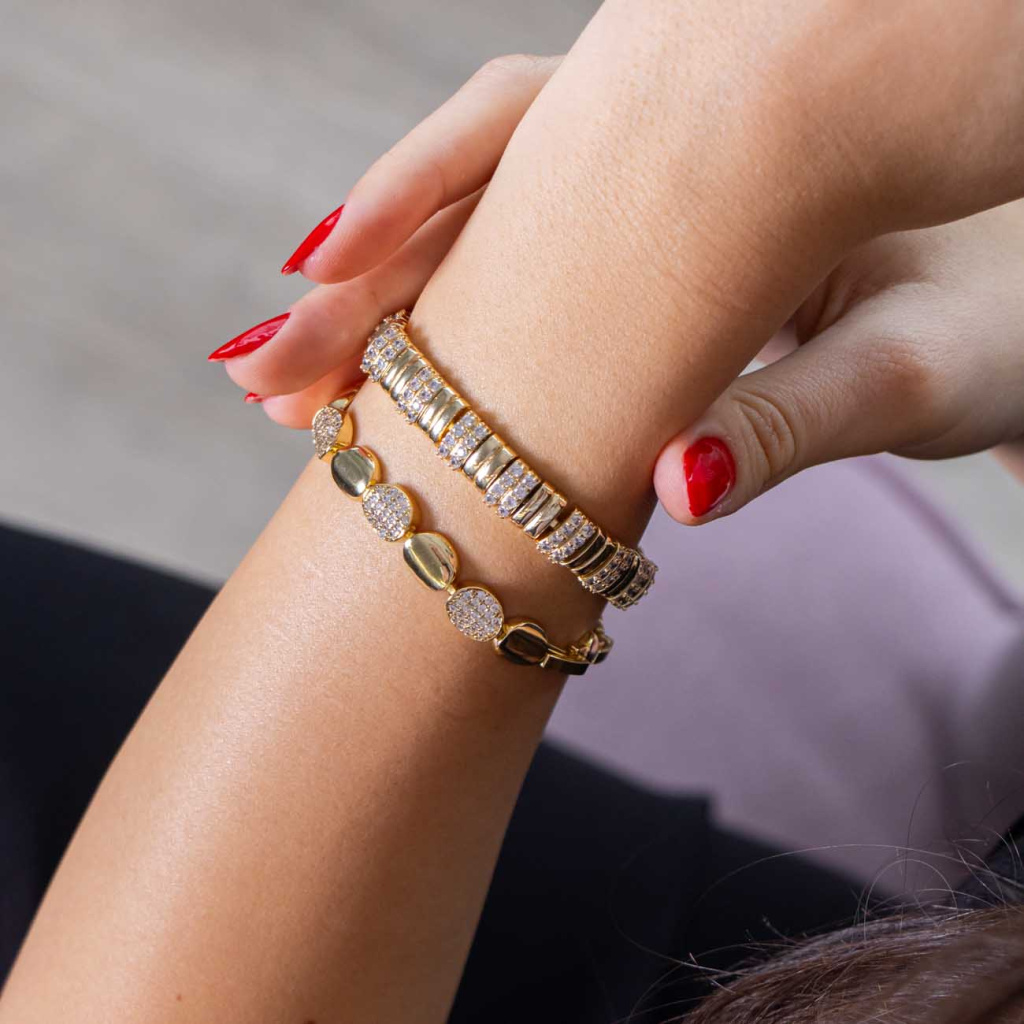 Tento výrazný náramek vyniká elegantní strukturou článků a hustým osazením třpytivými zirkony ve dvou liniích, které vytvářejí okouzlující hru světla. Jeho precizní zpracování a zlatý lesk z něj činí dokonalý doplněk pro výjimečné příležitosti i stylové každodenní nošení.