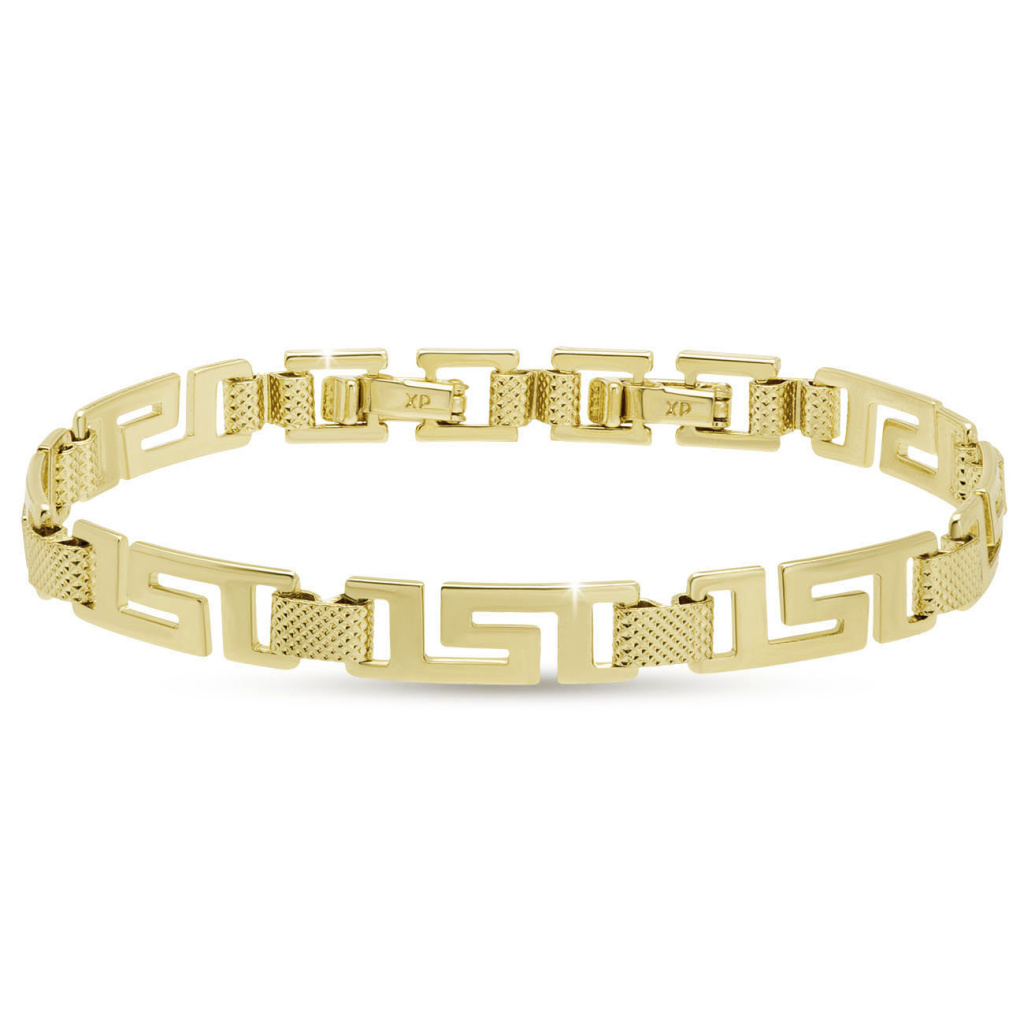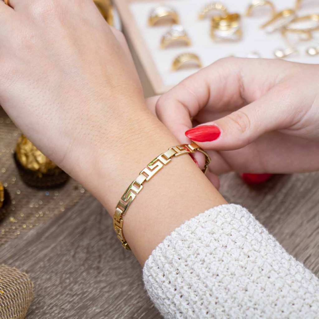 Výrazný náramek inspirovaný motivem řeckého klíče zaujme elegantní kombinací lesklých a jemně strukturovaných článků. Jeho pevné článkové provedení působí luxusně a zároveň pohodlně padne na zápěstí. Nadčasový design se skvěle hodí jak ke každodennímu outfitu, tak i ke slavnostním příležitostem.