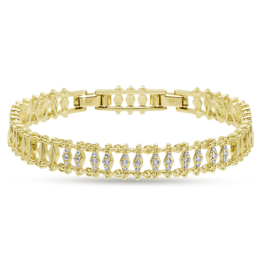 Elegantní náramek s propracovaným článkovým vzorem, který připomíná šperkařskou krajku. Drobné zirkony vsazené mezi geometrické prvky vytvářejí jemný třpyt a dodávají šperku sofistikovaný půvab. Vhodný jako stylový doplněk pro denní nošení i slavnostní příležitosti.