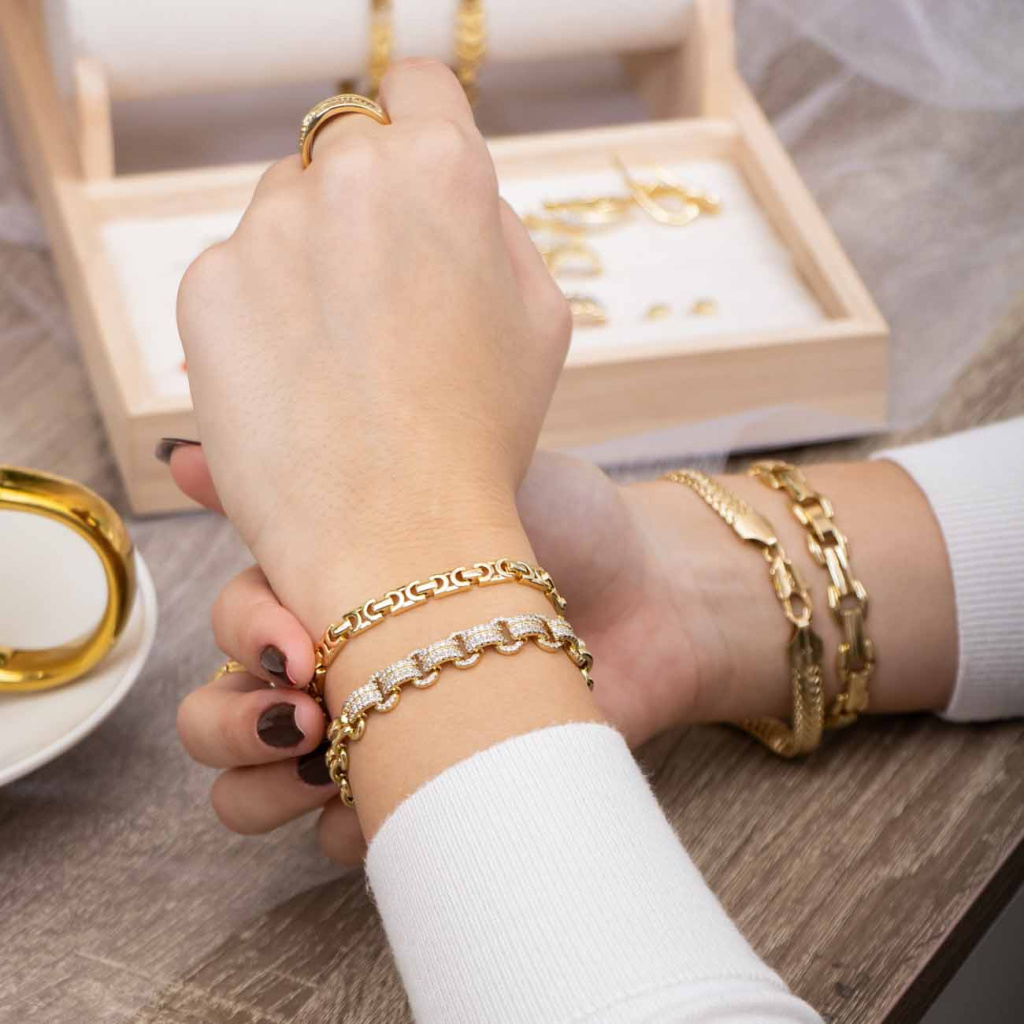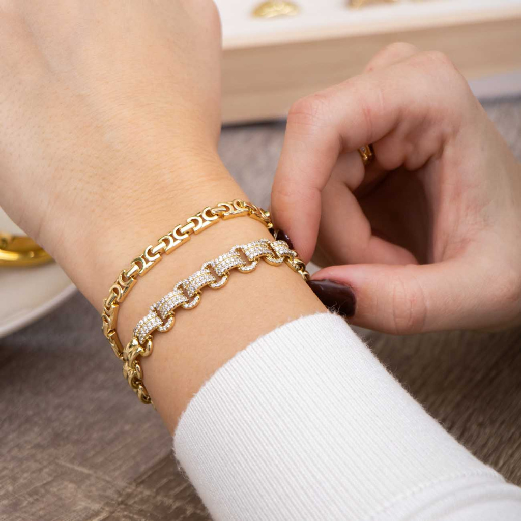 Luxusní a výrazný náramek, který zaujme bohatým leskem a originálním článkovým designem. Každý prvek je osazený drobnými zirkony, které vytvářejí dojem zářivého šperku vhodného pro výjimečné příležitosti i slavnostní večery. Díky prodlužovacímu článku se snadno přizpůsobí zápěstí.