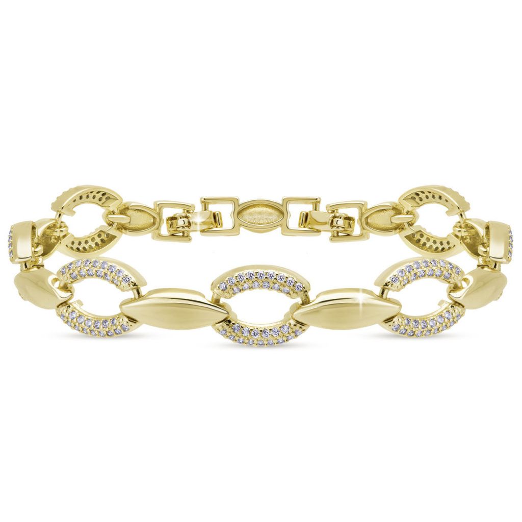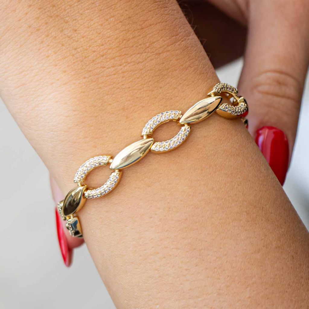 Tento výrazný a zářivý náramek okouzlí svým precizním designem a bohatým zdobením zirkony. Kombinace hladkých a třpytivých článků vytváří nadčasový šperk, který působí elegantně a velmi sofistikovaně.