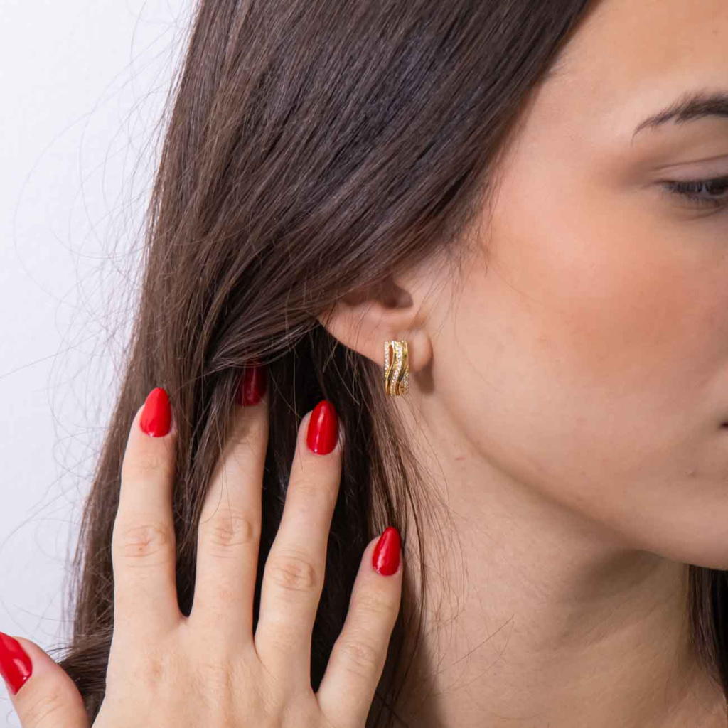 Náušnice s výrazným designem a bohatým osazením čirými zirkony zaujmou svým leskem a precizním zpracováním. Elegantní oblý tvar doplňují tři jemně zakřivené linie, které dodávají šperku dynamičnost a luxusní vzhled.
