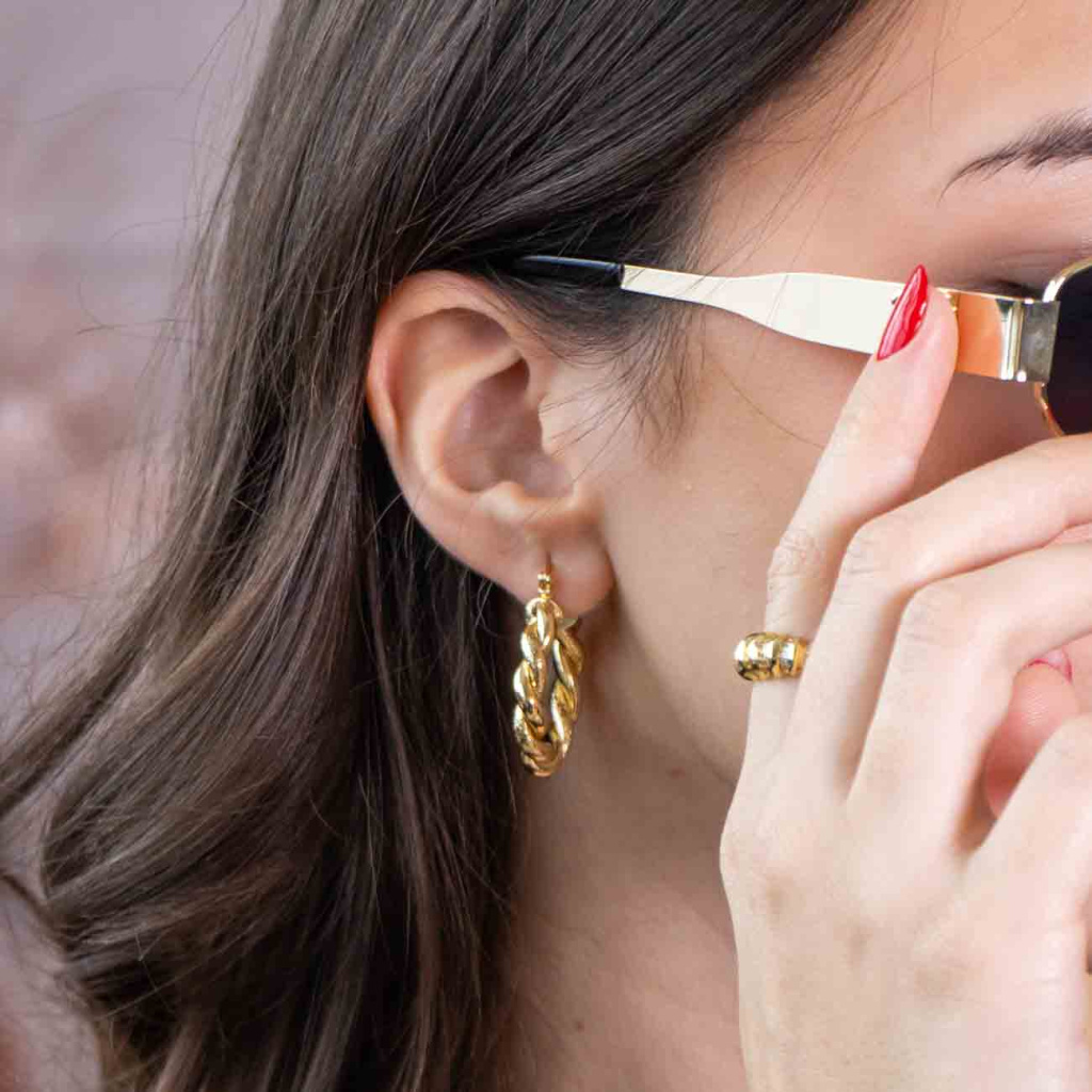 Výrazné náušnice v kruhovém designu s efektním točeným povrchem kombinují lesklé a matné textury, které krásně odrážejí světlo. Elegantní provedení dodá šmrnc každému outfitu – od denního nošení až po večerní příležitosti.