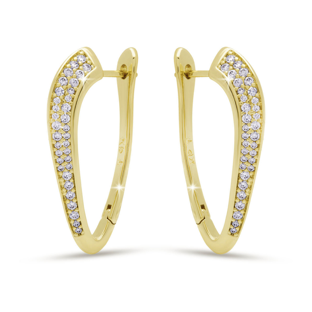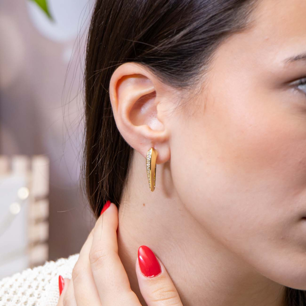 Výrazné, přitom jemně zaoblené náušnice s originální křivkou, která krásně kopíruje linii ucha. Přední stranu zdobí dvě linie drobných čirých zirkonů, které dodávají náušnicím jemný třpyt a luxusní vzhled. Stylový doplněk pro každodenní i večerní nošení.