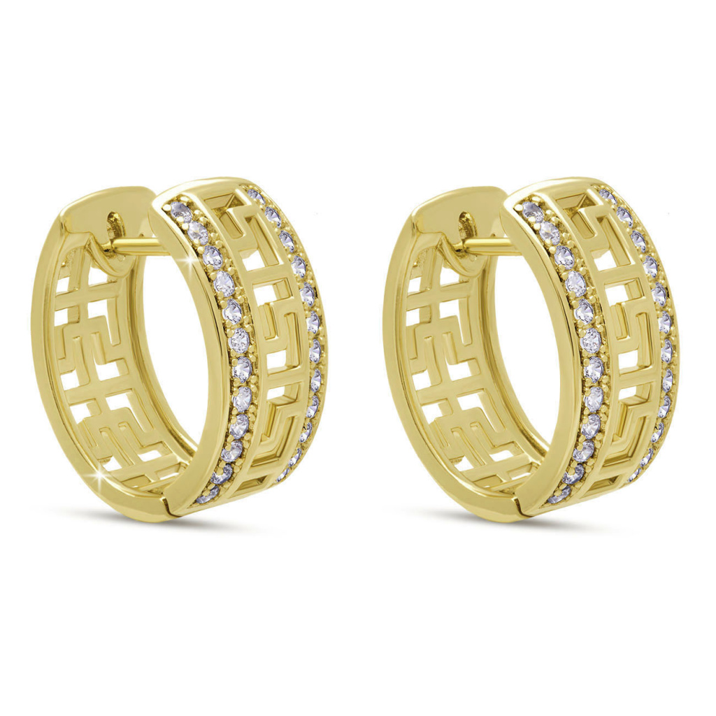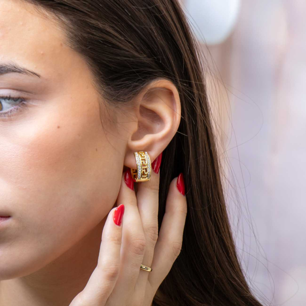 Nepřehlédnutelné pozlacené náušnice s řeckým vzorem a linií čirých zirkonů na přední straně. Kombinace geometrického designu a třpytivých kamenů působí elegantně, ale zároveň velmi současně. Perfektní volba pro ženy, které milují originální šperky s charakterem.