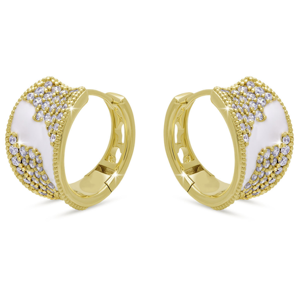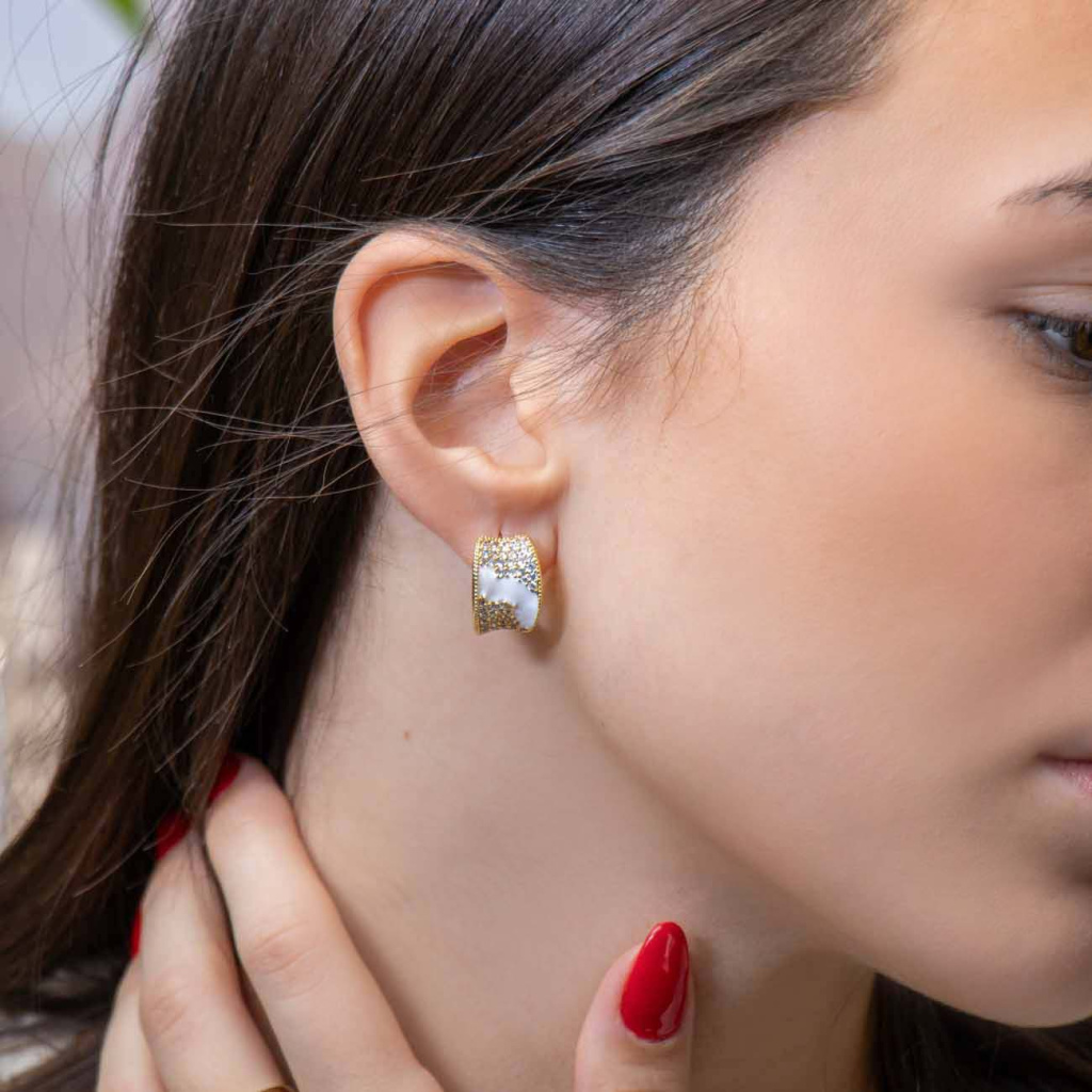 Výrazné kruhové náušnice s elegantním smaltovým povrchem a bohatým osazením třpytivými zirkony okouzlí svou originalitou i precizním provedením. Kontrast lesklého zlata, jemného bílého smaltu a zářivých kamínků vytváří sofistikovaný dojem, který zaujme na první pohled.