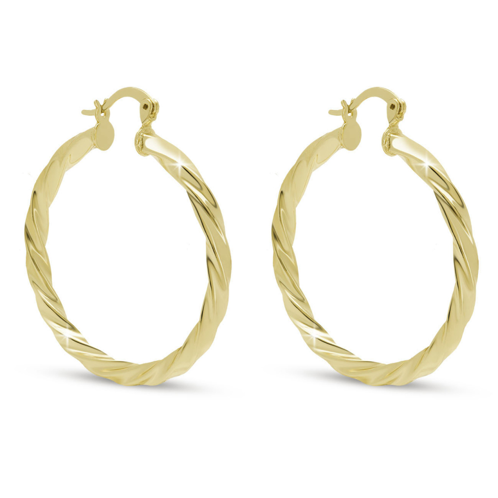 Zářivé pozlacené kruhové náušnice z rhodiovaného kovu s jemným spirálovým efektem. Elegantní a nadčasový doplněk.