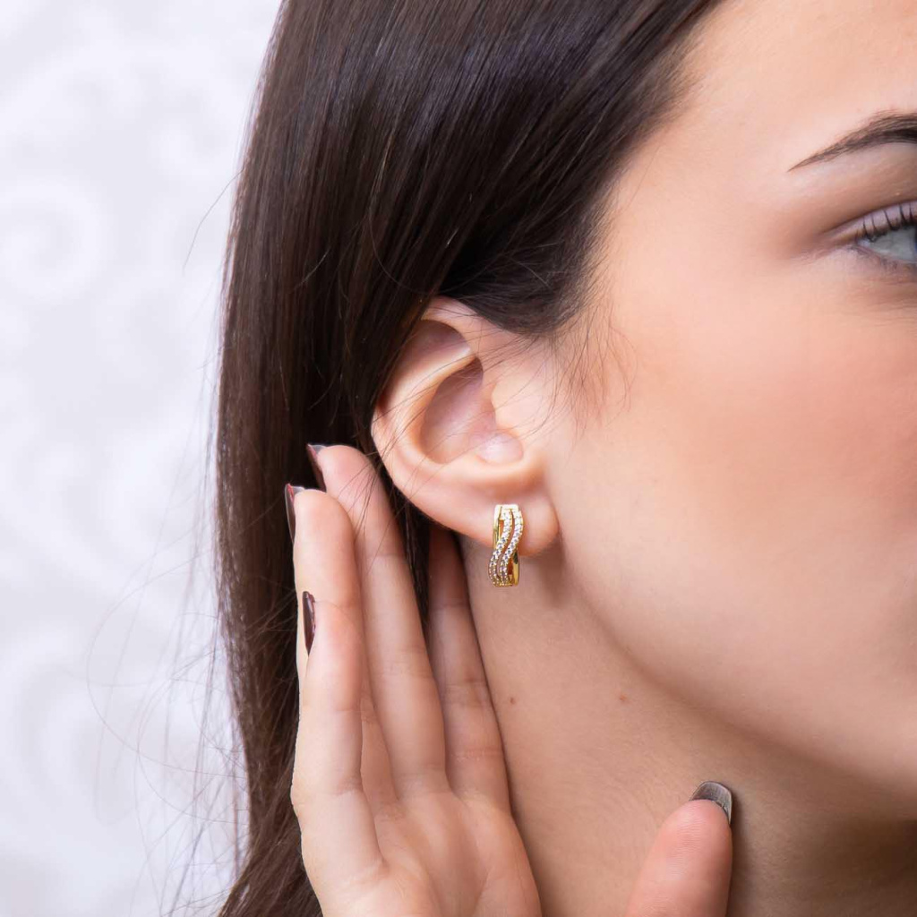 Pozlacené náušnice z rhodiovaného kovu se zirkony a liniovým zdobením. Zářivý, jemný a nadčasový doplněk pro elegantní styl.