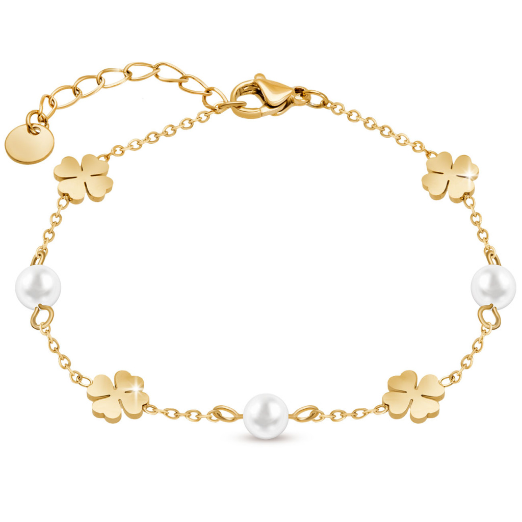 Zářivý náramek s motivem čtyřlístku přináší jemný symbol štěstí v precizním provedení. Kombinace lesklého pozlaceného povrchu a perel působí nadčasově a zároveň výrazně. Elegantní detail, který rozzáří Vaše zápěstí při každé příležitosti.