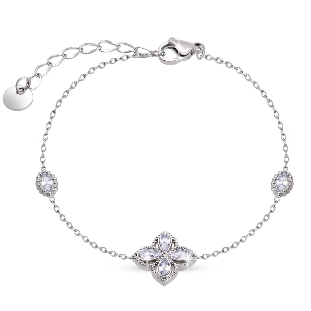 Náramek z chirurgické oceli s květinou a zirkony, délka 16,5 + 3,5 cm. Jemný, zářivý a nadčasový doplněk se zapínáním na karabinku.