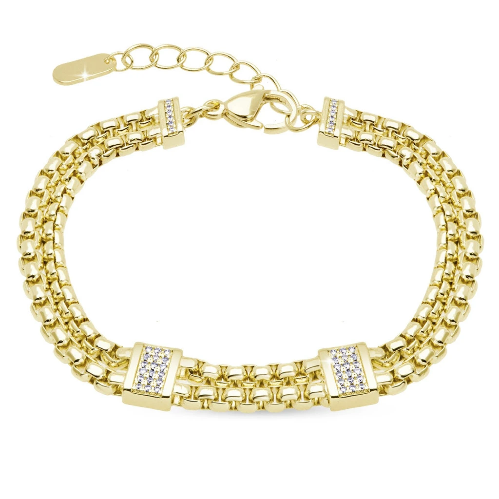 Zářivý náramek v pozlaceném provedení okouzlí precizním zpracováním a elegantní kombinací jemných řetízků a třpytivých detailů. Výrazné obdélníkové prvky se zirkony dodávají šperku sofistikovaný charakter, který podtrhne Vaši jedinečnost. Nadčasový design se snadno sladí s každodenním i slavnostním outfitem.