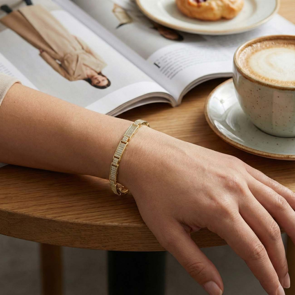 Vkusný náramek s pravidelně členěným článkovým designem je bohatě zdoben drobnými zirkony, které mu dodávají sofistikovaný lesk. Díky štíhlému provedení působí jemně, přesto výrazně a elegantně doplní slavnostní i každodenní outfit. Pozlacení 14K zlatem podtrhuje luxusní charakter šperku a precizní zpracování zajišťuje pohodlné a bezpečné nošení.