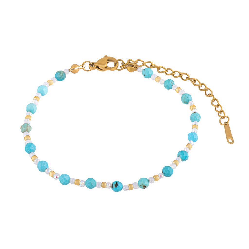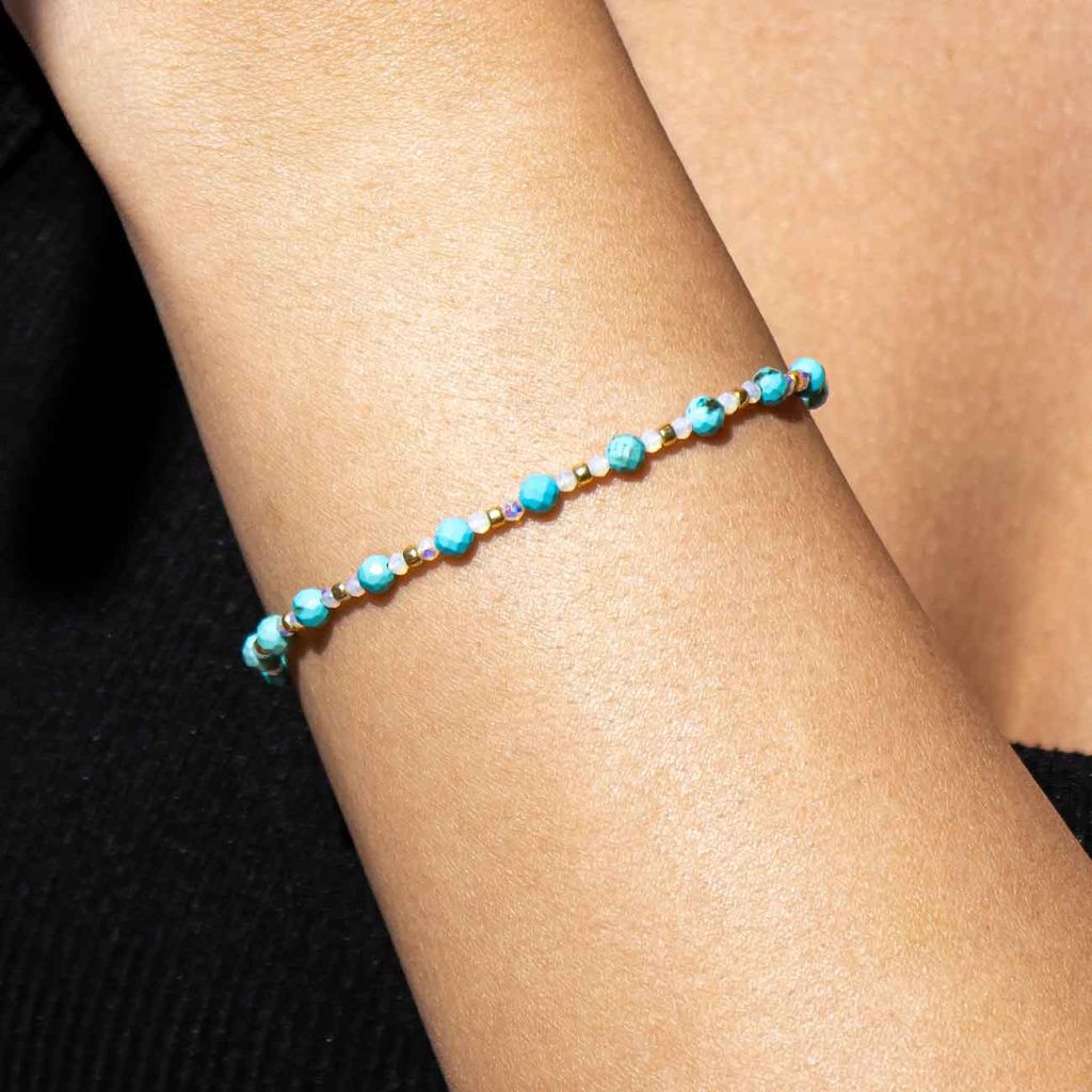 Zářivý doplněk, který vnese do Vašeho stylu svěžest a lehkost. Jemné korálky v tyrkysových tónech v kombinaci se zlatými detaily působí elegantně a zároveň hravě. Ideální volba pro každodenní nošení i letní outfit.