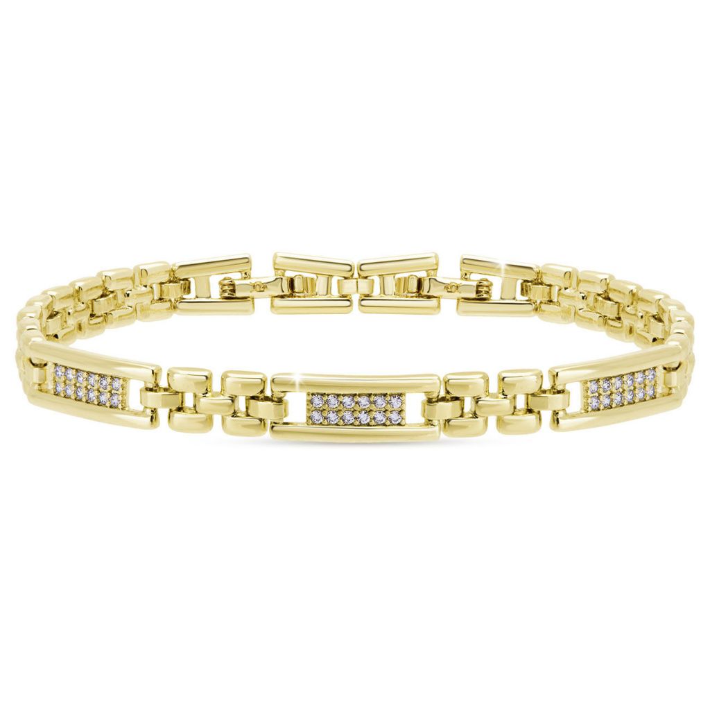 Zářivý náramek, který na první pohled upoutá svou precizní strukturou a jemným třpytem. Kombinace hladkých článků a oslnivých zirkonů vytváří nadčasový šperk, který podtrhne Váš styl při každé příležitosti. Výrazný, a přesto elegantní doplněk, který si zamilujete.