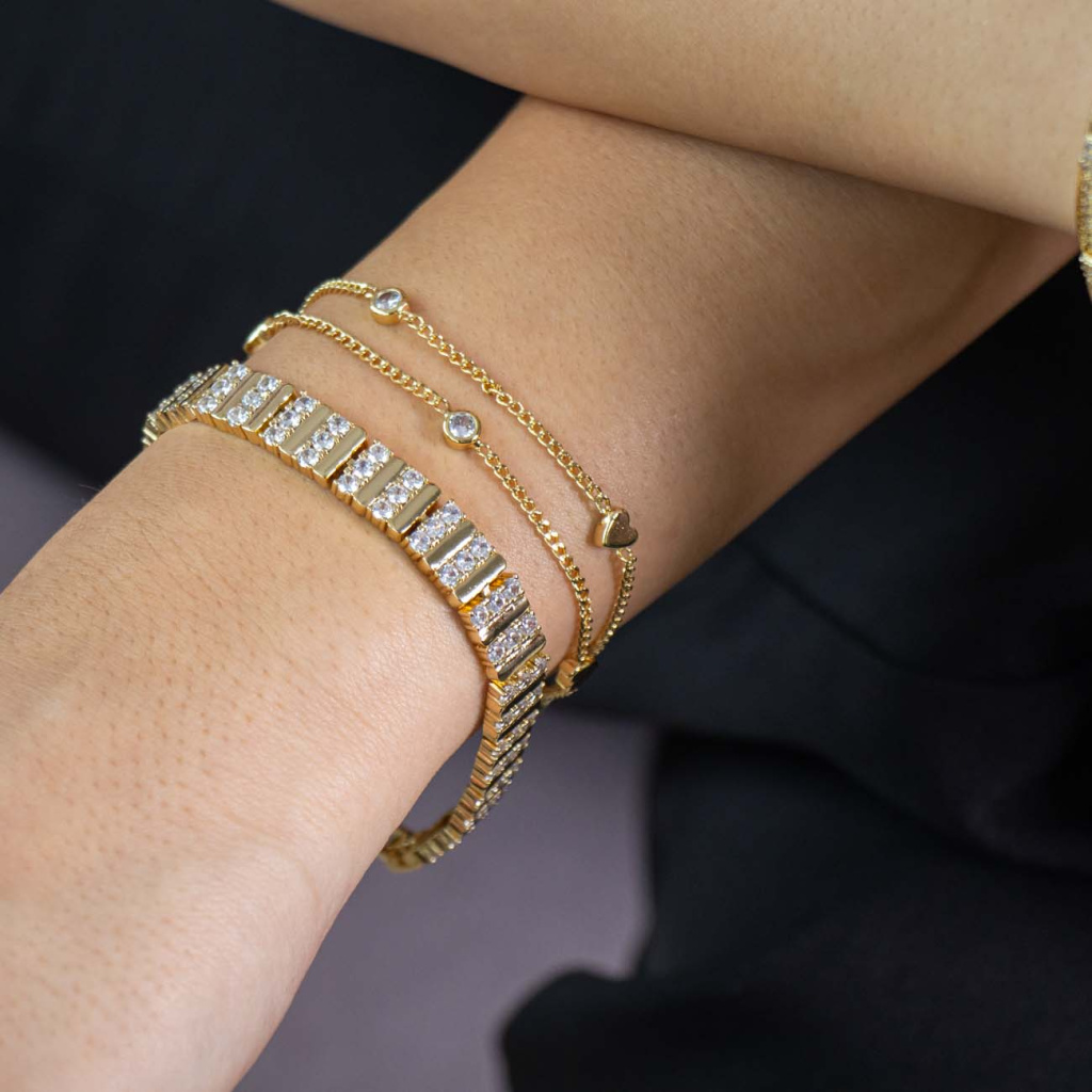 Elegantní náramek pozlacený 14K zlatem osazený řadami třpytivých zirkonů působí luxusně a nadčasově.