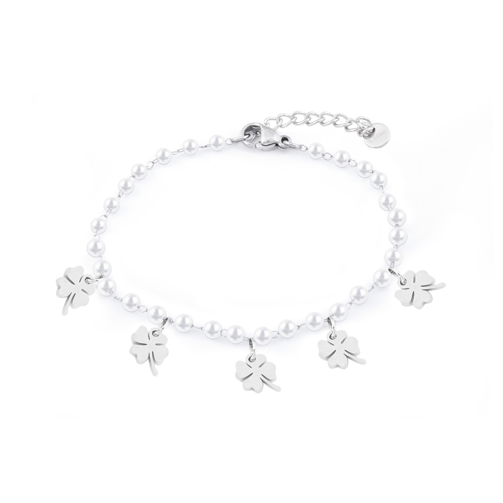 - Náramek na ruku z chirurgické oceli, ozdobený perličkami v bílé barvě a přívěsky čtyřlístků.