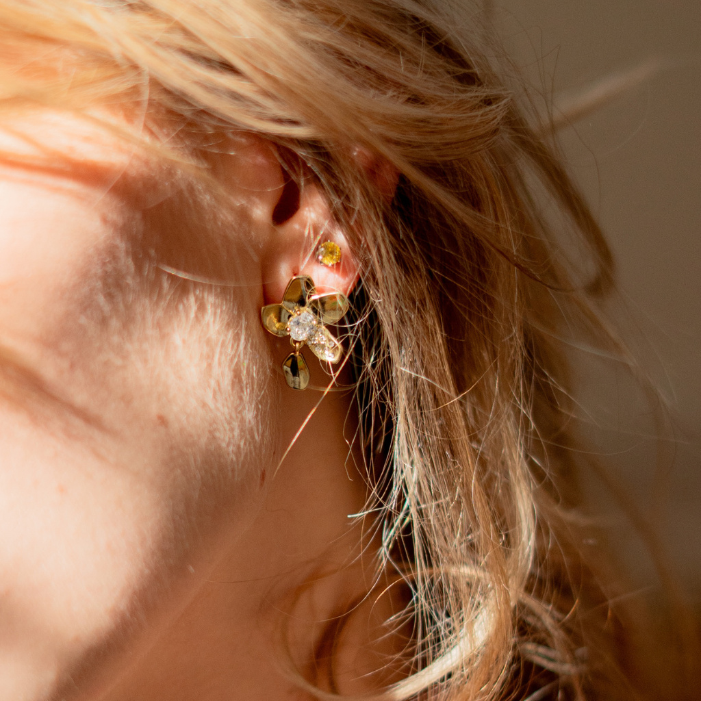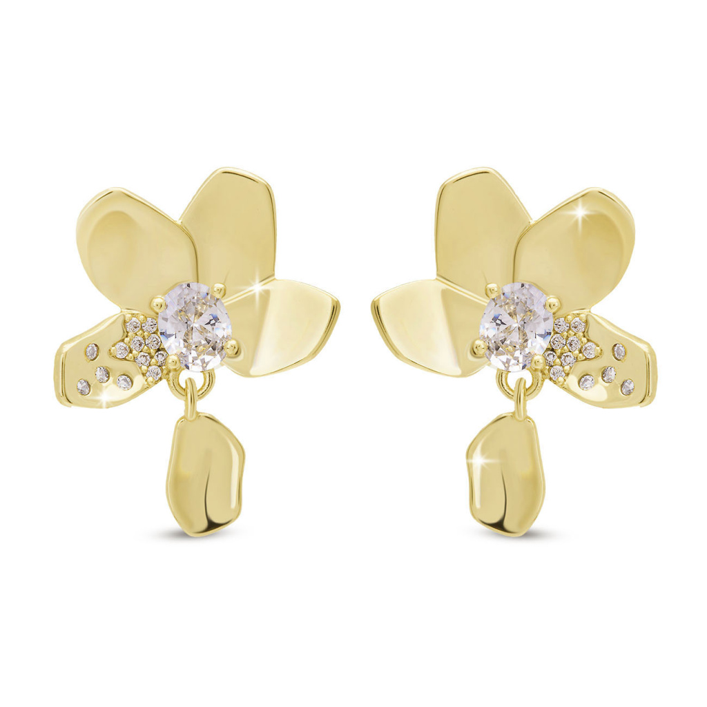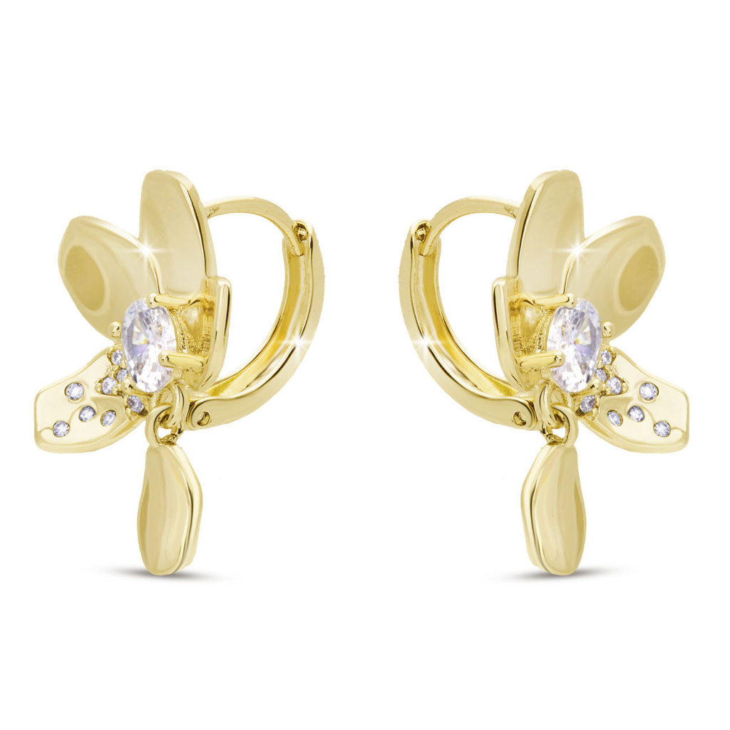 Vylepšete svůj styl těmito úžasnými pozlacenými náušnicemi! Tyto 14karátové pozlacené náušnice květina s okvětním lístkem na očku se zirkonovým středem. Krásné náušnice s klasickým zapínáním , vyrobené z rhodiovaného kovu a vyleštěné k dokonalosti, zůstanou pevně připevněné a zároveň antialergické pro dlouhotrvající pohodlí. Přidejte elegantní dotek k jakémukoli oblečení a hýbejte tímto trendy šperkem po celý den!