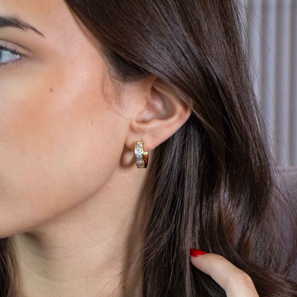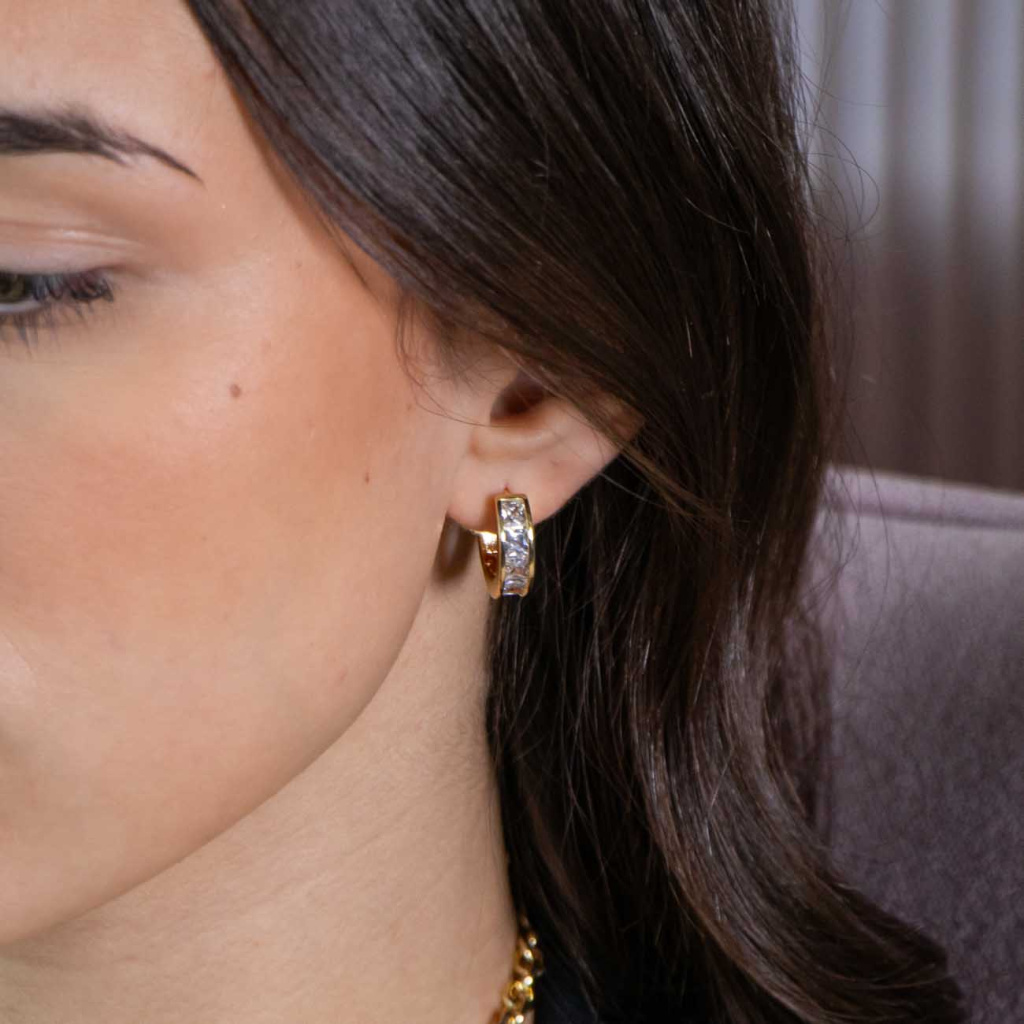 Elegantní kruhové náušnice s jemně broušenými čirými zirkony v hranatém brusu září sofistikovaným leskem. Díky čistému designu a pozlacenému provedení se hodí ke každému outfitu – od každodenního nošení až po slavnostní příležitosti.