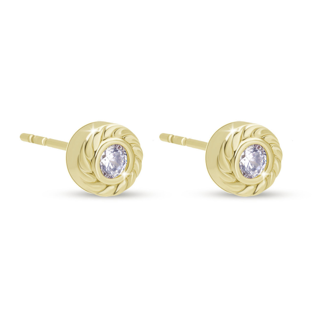 Jemné, ale výrazné náušnice s centrálním čirým zirkonem, který je zasazen do dekorativního plastického rámečku ve zlaté barvě. Elegantní spirálový motiv rámu dodává šperku rafinovaný vzhled. Ideální pro každodenní nošení i jako decentní doplněk na večer.