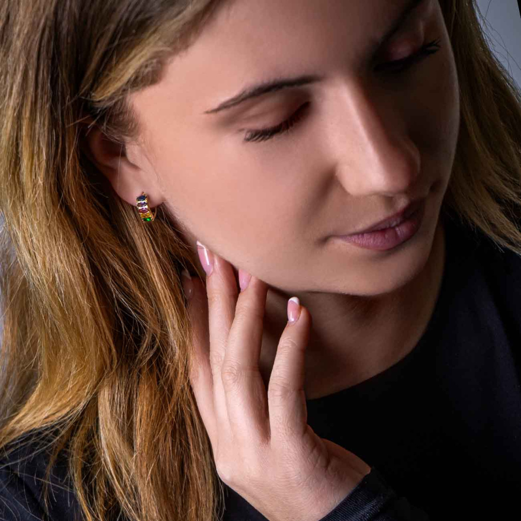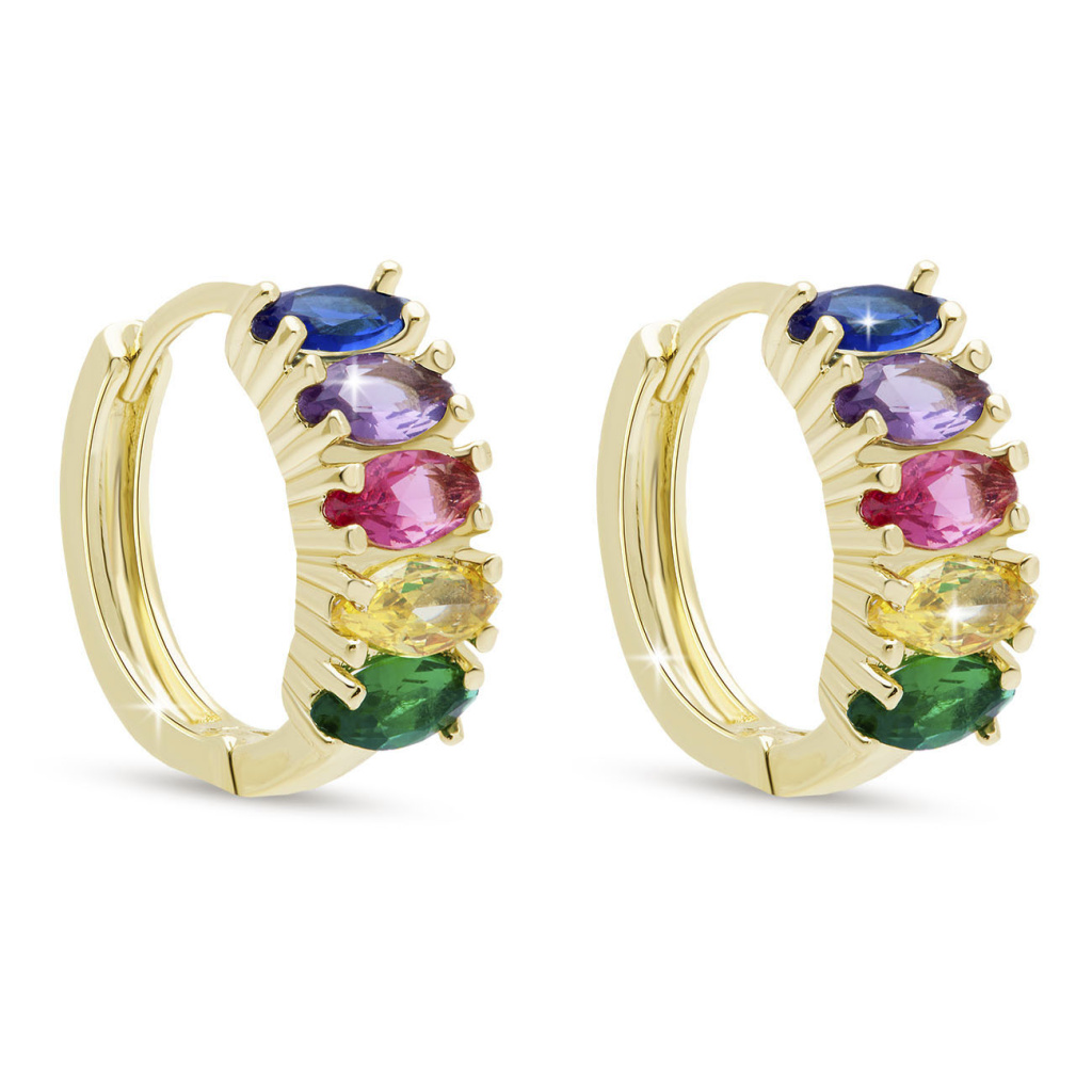 Vylepšete svůj styl s těmito úžasnými pozlacenými náušnicemi! Tyto 14karátové pozlacené náušnice mají originální kruhový design. Krásné náušnice s klasickým zapínáním, vyrobené z rhodiovaného kovu a vyleštěné k dokonalosti, zůstanou pevně připevněné a zároveň antialergické pro dlouhotrvající pohodlí. Náušnice mají motiv oblíbeného kroužku, který je ozdoben barevnými kamínky zirkonů.