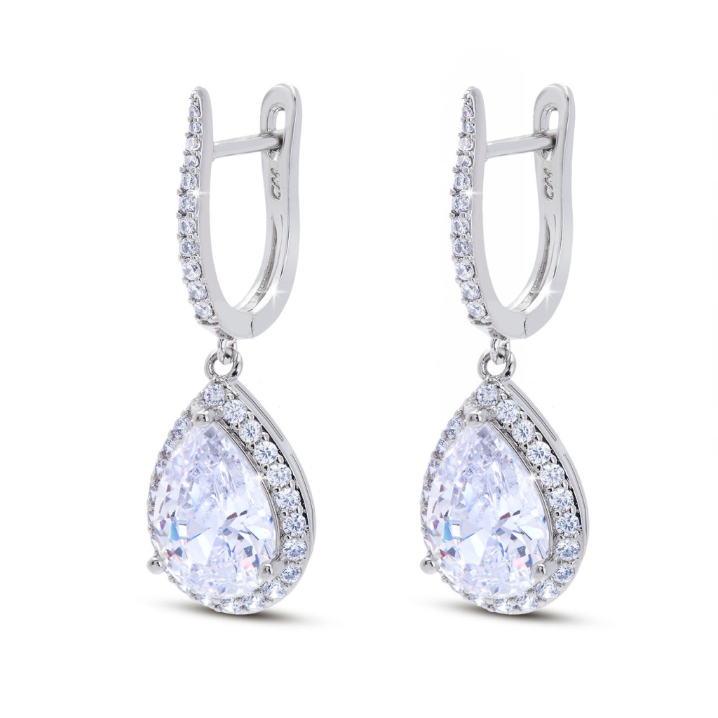 Rhodiované náušnice s velkým zirkonem ve tvaru kapky, lemovaným poobvodu malými zirkony. Velmi efektní je rovněž část na zapínání - to je rovněž osazeno malými zirkony. Vhodné na slavnostnější události či večírky. Navíc s nimi budete vždy působit jemně a upraveně. Tento výrobek neobsahuje těžké kovy.