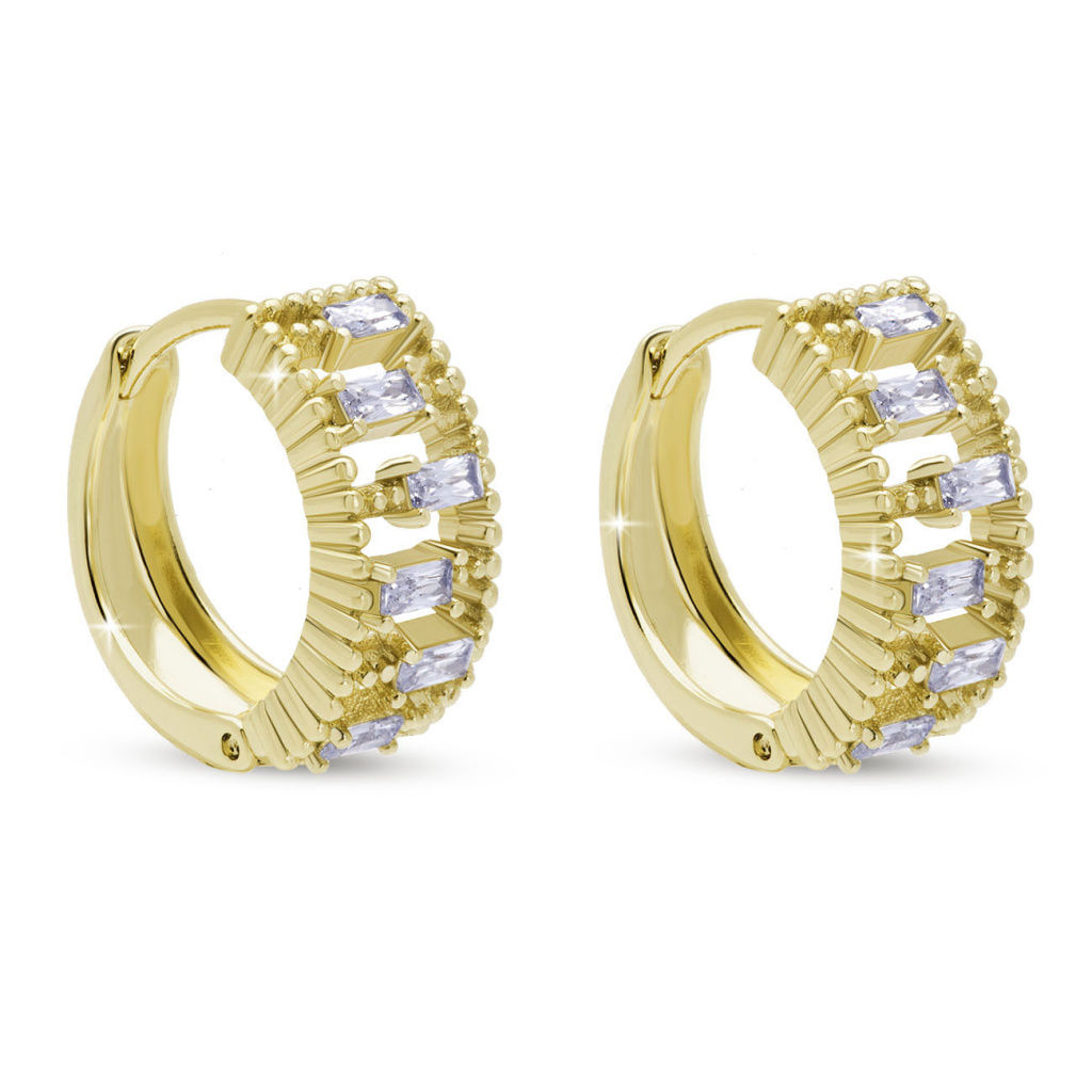Pozlacené náušnice z rhodiovaného kovu s geometrickým zdobením. Zářivý, výrazný a nadčasový doplněk pro elegantní styl.
