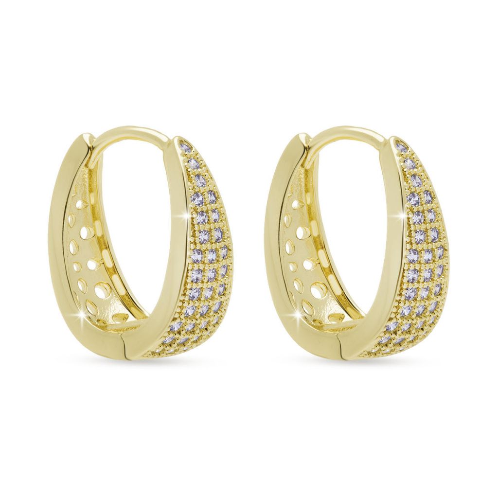 Tyto náušnice zaujmou svým výrazným tvarem a precizně osazenými zirkony, které dodávají šperku zářivý a luxusní vzhled. Díky pozlacení 14K zlatem působí elegantně a nadčasově, takže se stanou nepřehlédnutelným doplňkem pro každou příležitost. Ideální volba pro ženy, které milují jemný lesk spojený s výrazným stylem.