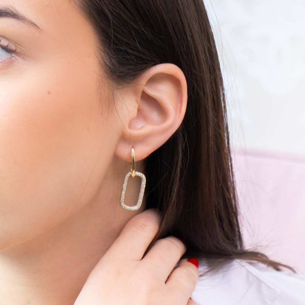 Moderní visací náušnice s jemným geometrickým pojetím zaujmou svým leskem i tvarem. Dvě propojené části – hladká horní a výrazná spodní ve tvaru oválného „O“ osazeného čirými zirkony – tvoří harmonický celek. Skvěle doplní jak každodenní outfit, tak slavnostní vzhled. Zapínání je řešeno praktickou klapkou (ruské zapínání).