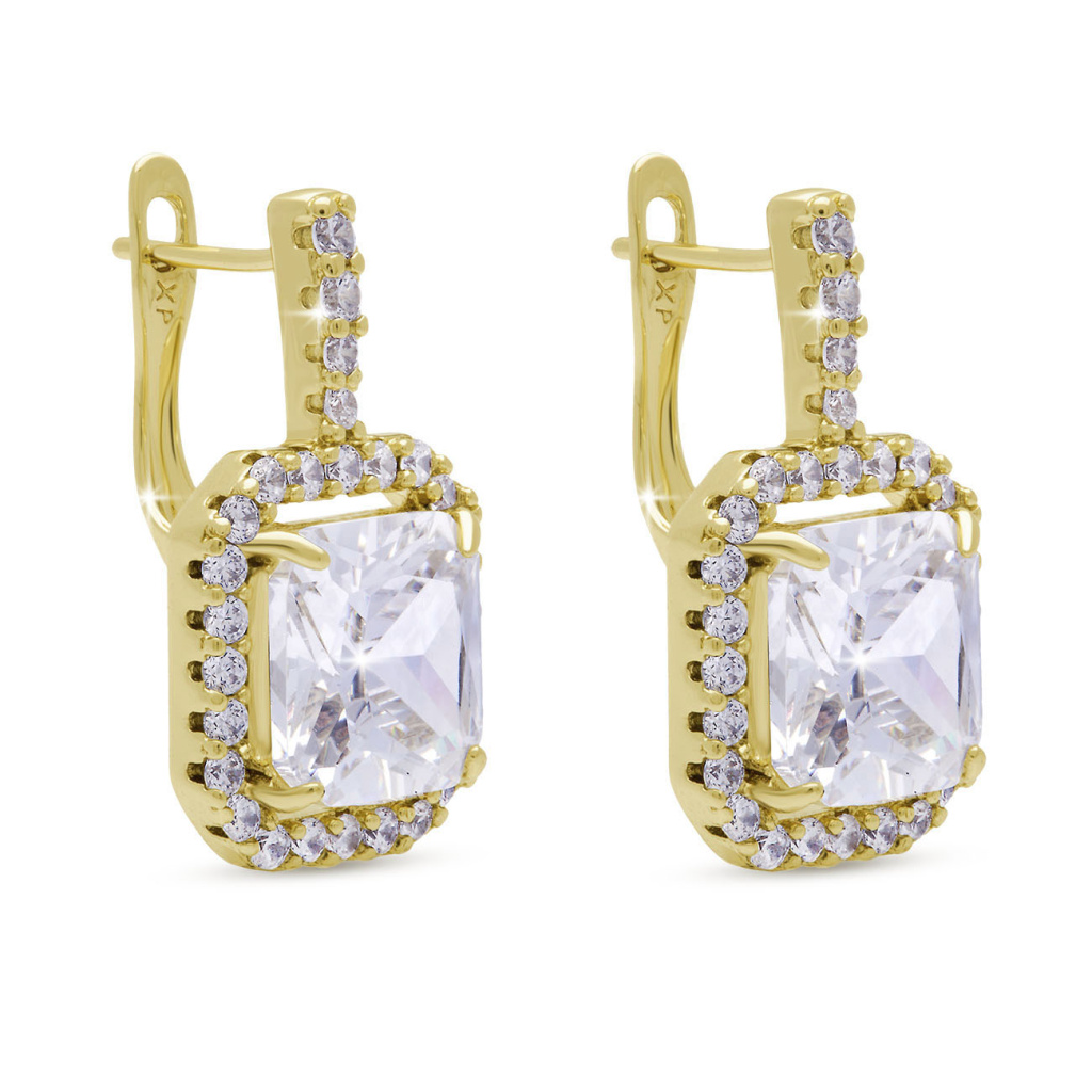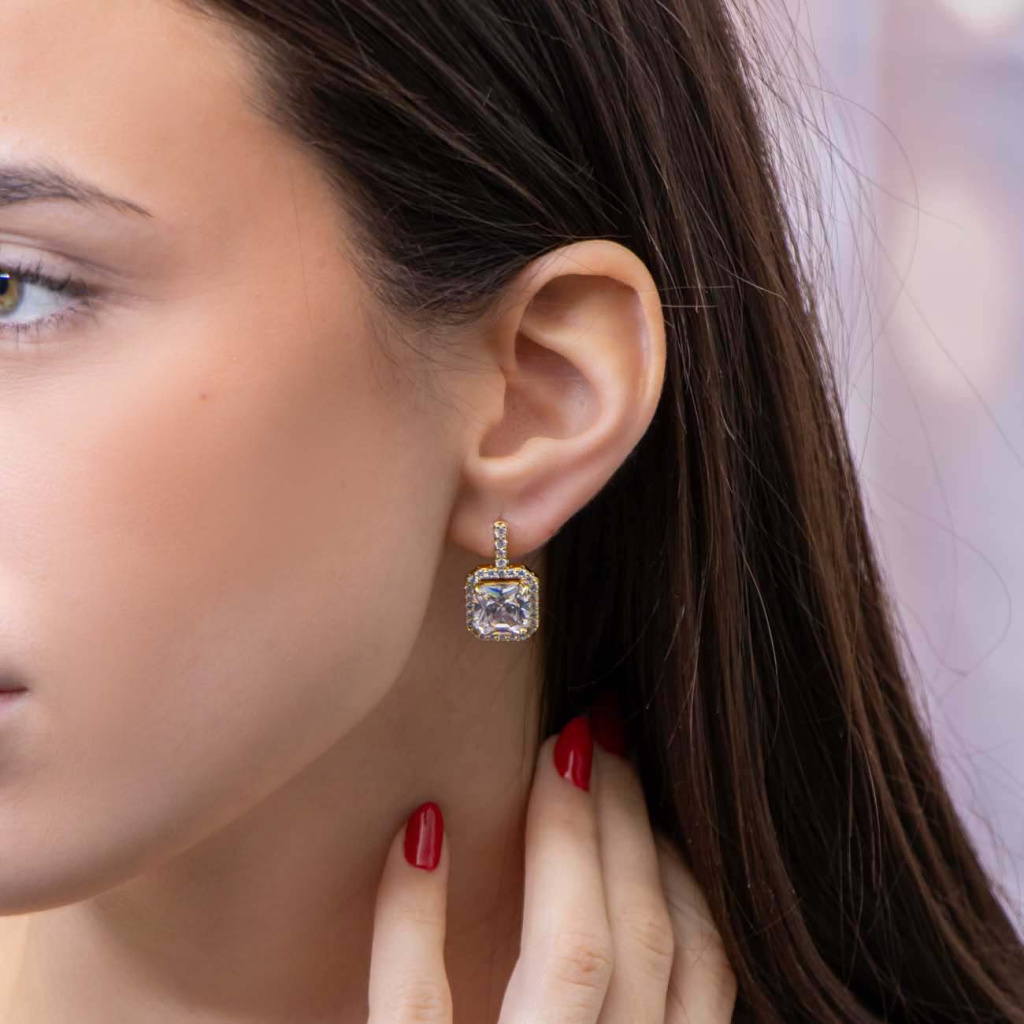 Elegantní náušnice s výrazným čtvercovým zirkonem uprostřed, lemovaným drobnými třpytivými kamínky, působí jako šperk hodný červeného koberce. Precizně broušené zirkony a lesklý povrch dodávají náušnicím výjimečný glamour efekt. Ideální volba pro slavnostní příležitosti i večerní outfit.