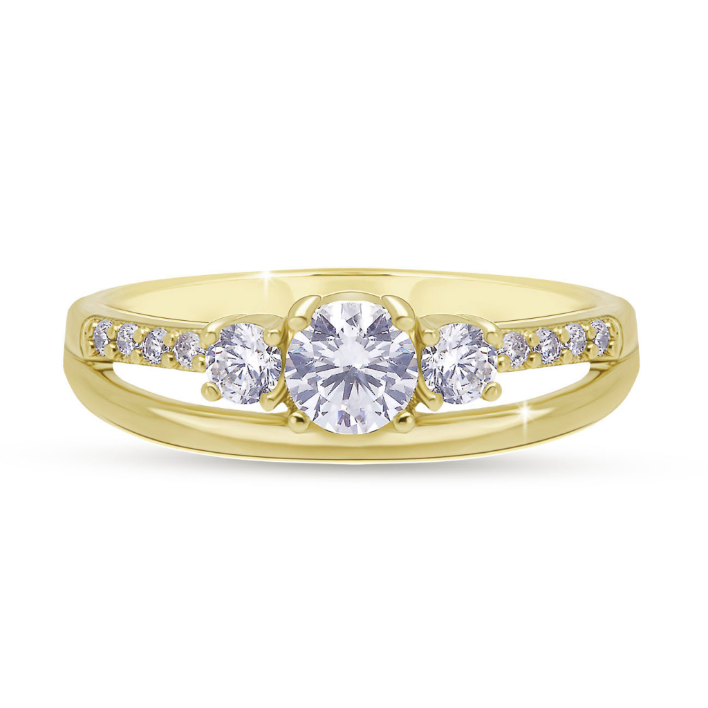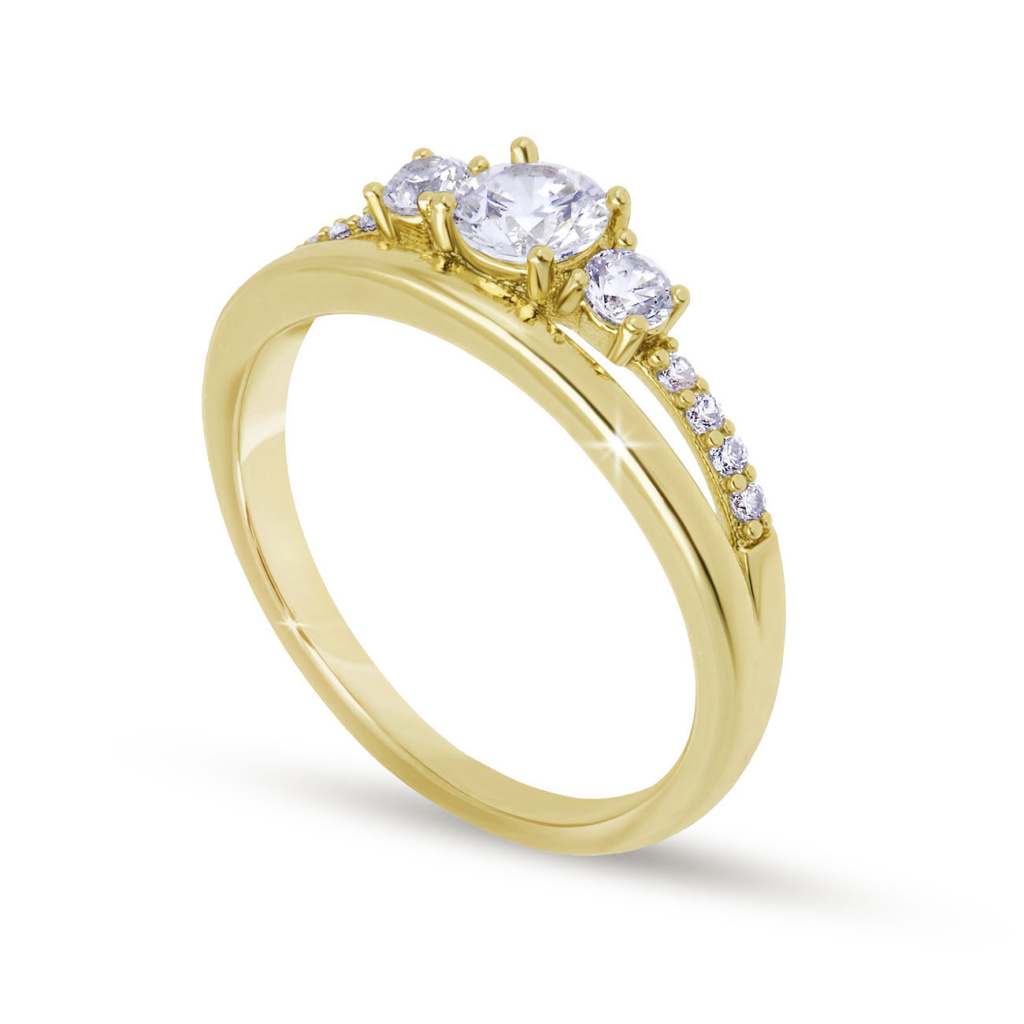 Elegantní model s trojicí výrazných čirých zirkonů, z nichž střední je dominantní. Prsten je doplněn jemnými kamínky po stranách, které podtrhují jeho třpyt a klasickou krásu. Vhodný jako dar z lásky i slavnostní doplněk.