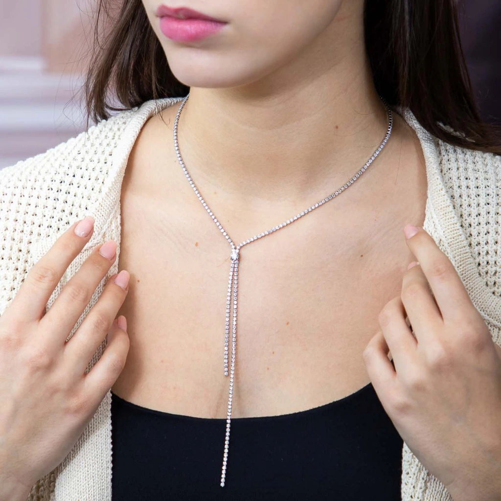 Zářivý Y náhrdelník z chirurgické oceli se zirkony. Elegantní dlouhý přívěsek, nastavitelná délka a nadčasový design pro výjimečné chvíle.