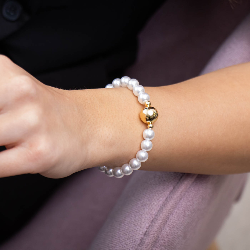 Vkusný náramek tvořený pravidelnými perlovými korálky působí čistě, nadčasově a velmi elegantně. Středový hladký korálek pozlacený 14K zlatem vytváří výrazný kontrast a dodává šperku luxusní akcent, zatímco menší zlaté korálky jemně dotvářejí celkovou kompozici. Díky pružnému provedení se náramek pohodlně nosí a stává se ideálním doplňkem každodenního i slavnostního outfitu.