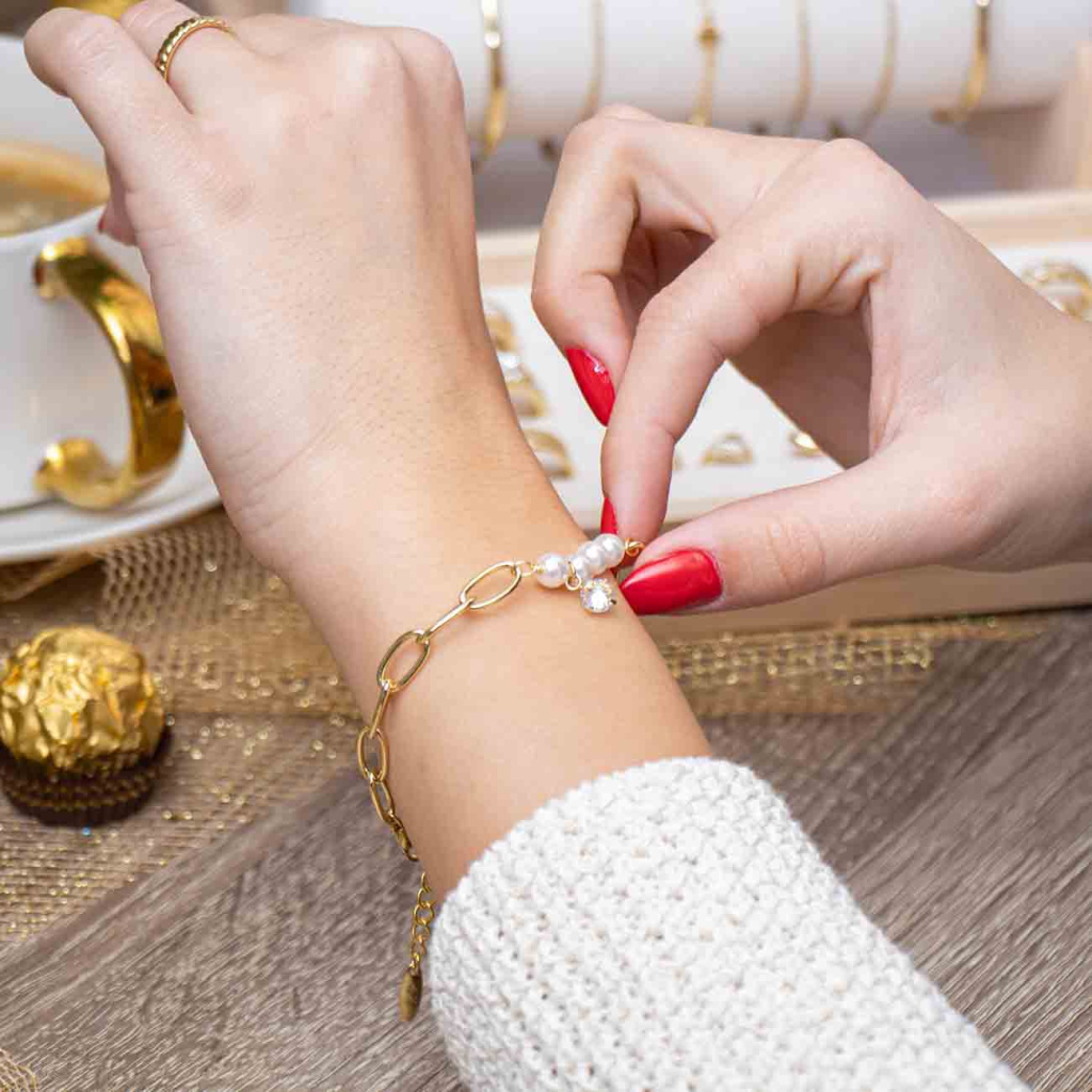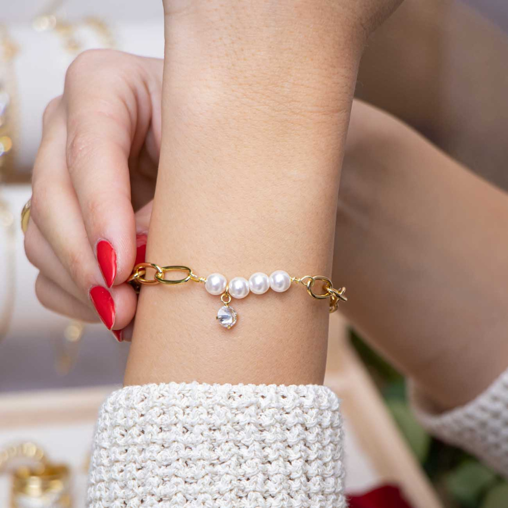 Jemný náramek s většími články v kombinaci s perlovými korálky a zavěšeným zirkonem působí jemně a elegantně. Harmonické propojení klasického šarmu perel s moderním řetízkovým designem dodá vašemu outfitu ženskost i stylový akcent. Ideální volba k ležérnímu oblečení i k večerním šatům.
