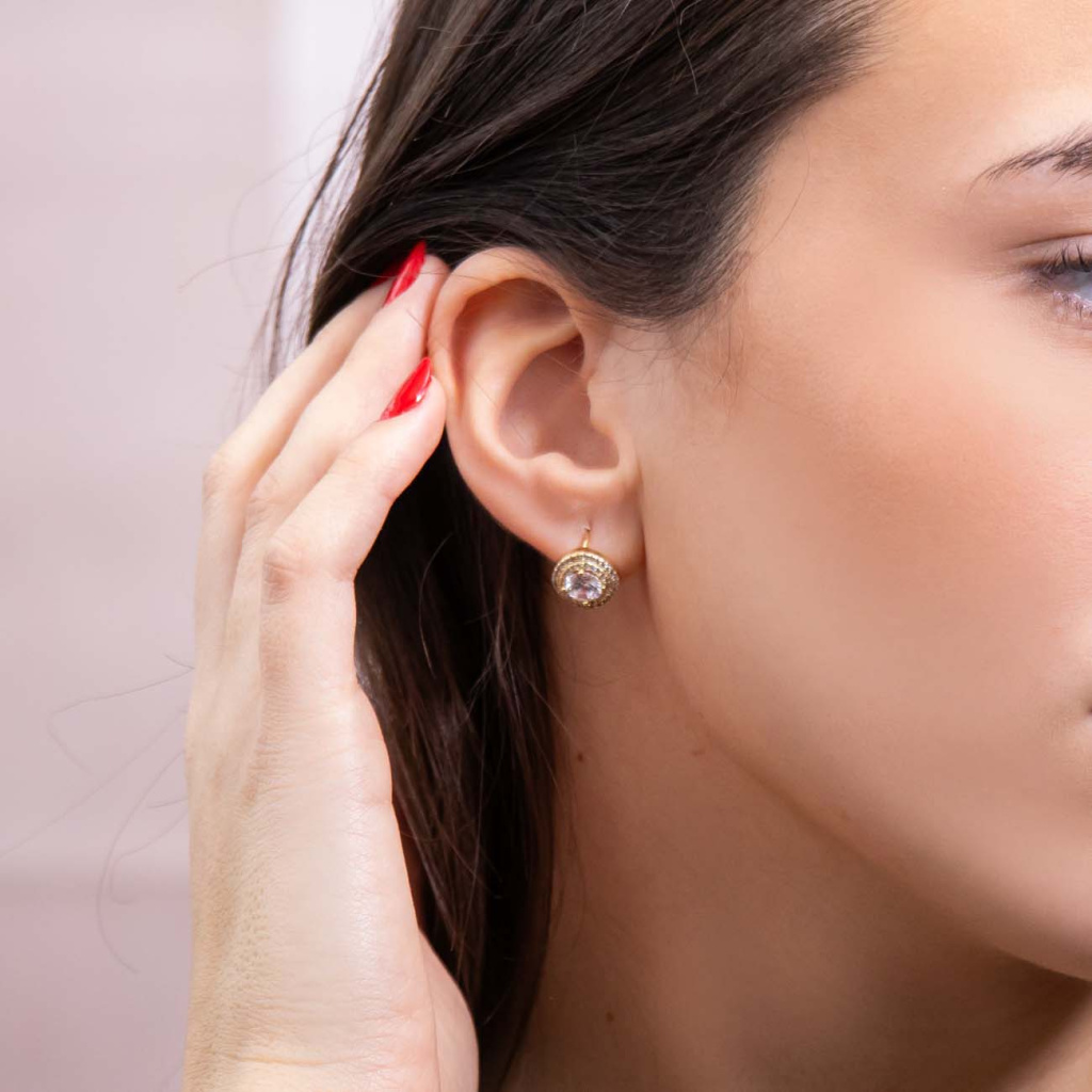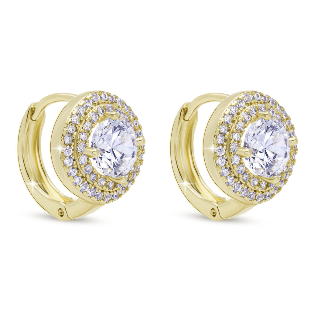 Zářivé náušnice s kulatým motivem osazeným třpytivými zirkony v několika řadách okouzlí svým luxusním vzhledem. Dominantní středový zirkon podtrhuje celkový dojem jemného, ale výrazného šperku. Pohodlné zapínání na klapku (ruské zapínání) zajišťuje bezpečné nošení.